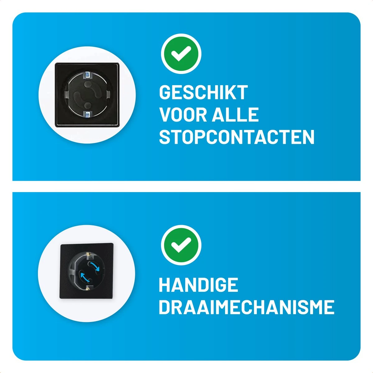 Door de handige draaimechanisme kan er met minimale inspanning een stekker al draaiend in het stopcontact worden geschoven. Zo’n afdekplaatje gaat alleen opzij als je met een stekker beide openingen tegelijk aandrukt. Voor jezelf is zo’n stopcontact misschien even wennen, maar voor een kind is het vrijwel onmogelijk om er iets in te proppen.