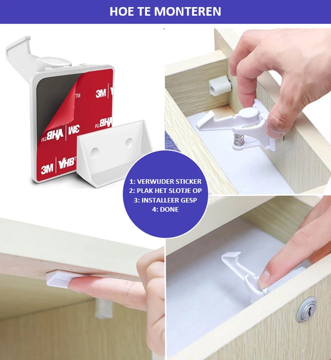 Met de zelfklevende en onzichtbare veiligheidssloten van T&D Shop hoef je daar niet meer bang voor te zijn! Nu 15 stuks met uitschakeloptie! Gemakkelijk te monteren zonder de gereedschapskoffer te gebruiken, dus ook voor de moeders of vaders met twee linkerhanden! Te openen zonder (magneet)sleutel!