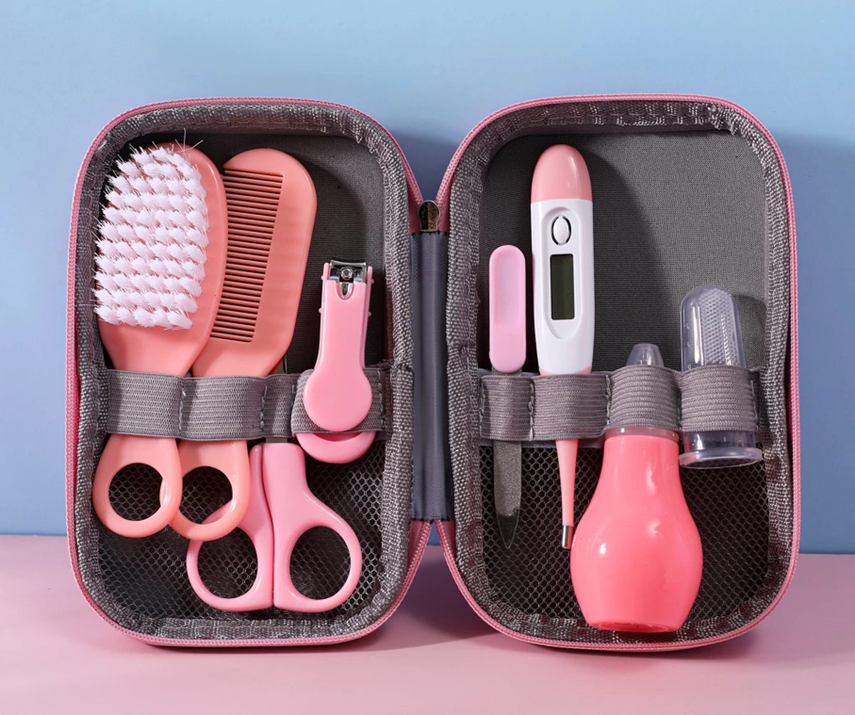 Inbegrepen: 1x opbergtas, 1x nagelknipper, 1x nagelvijl, 1x nagelschaartje, 1x borstel, 1x kam, 1x thermometer, 1x medicijnen pipet, 1x neus aspirator