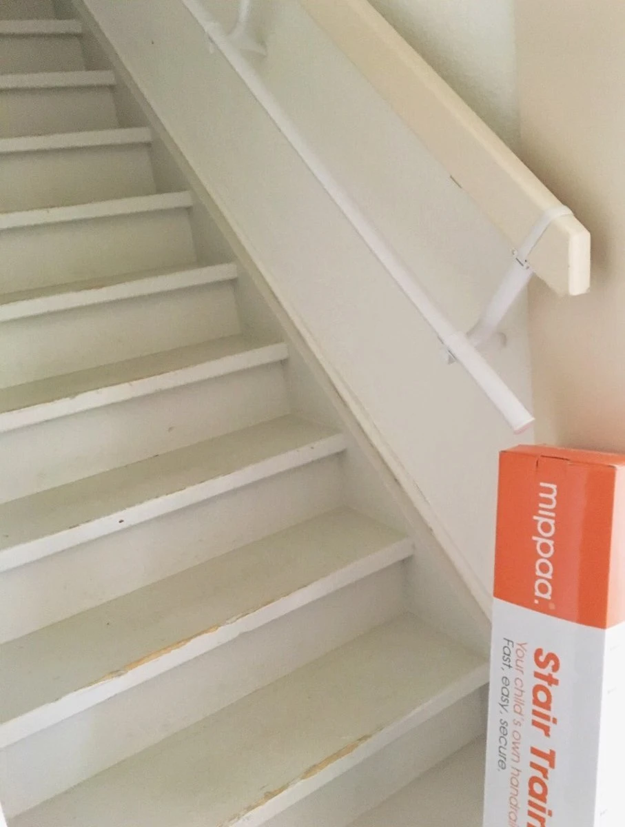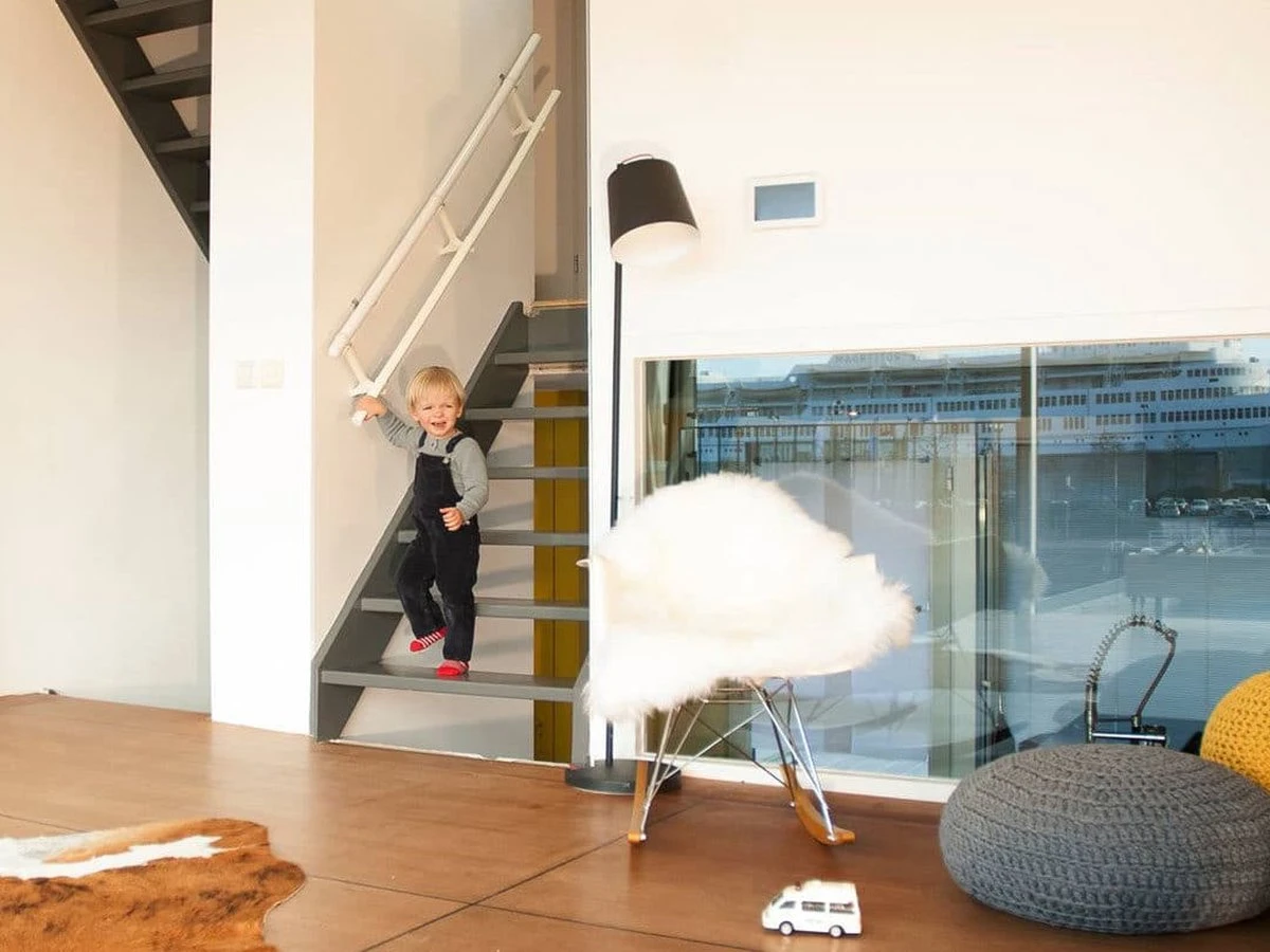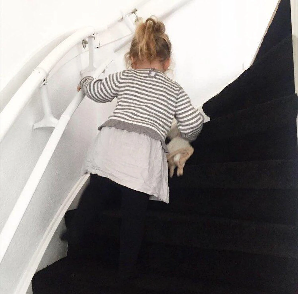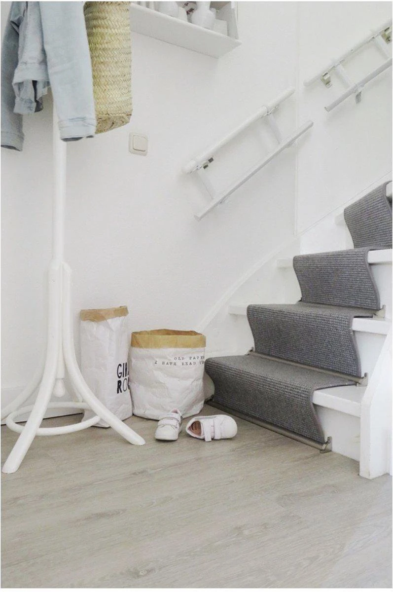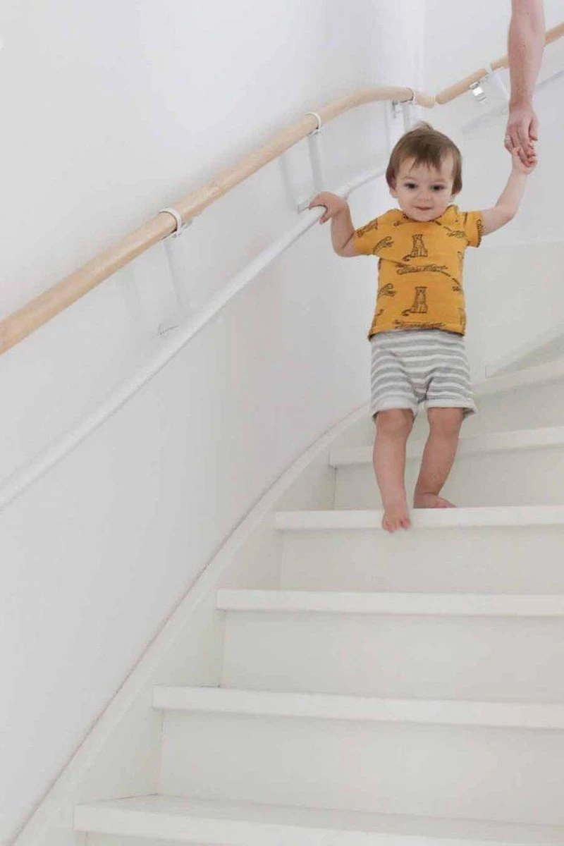 Peuters zelfstandig de trap op en af met de mippaa® Stair Trainer Kindertrapleuning voor in huis Een peuter die leert traplopen is voor ouders vaak een bron van angst. Je kind wil graag zelfstandig de trap op en af, maar de vaste trapleuning hangt te hoog. Daar is nu een oplossing voor: de mippaa® Stair Trainer. speciaal ontwikkeld voor kinderen De mippaa® Stair Trainer is een kindertrapleuning die heel makkelijk aan de bestaande trapleuning te bevestigen is. De leuning hangt lager en is smaller zodat kinderen hun leuning op eigen hoogte vast kunnen pakken. Door je kind een eigen leuning te geven, leer je jouw kind veiliger, stabieler en zelfstandig trap lopen. Dit geeft je kind meer zelfvertrouwen bij het traplopen en het geeft je als ouder een veiliger gevoel. Flexibel systeem Kort of lang, met of zonder bocht: de Stair Trainer past op ieder type trap. De Stair Trainer is flexibel genoeg om de glooiing in de bestaande leuning te volgen en is te bevestigen aan vrijwel ieder type trapleuning. De montage is makkelijk en snel. Wanneer de kinderen groot genoeg zijn om bij de bestaande leuning te kunnen, is de Stair Trainer makkelijk te verwijderen. Zonder boorgaten in de muur na te laten. De Basic kit (A Set) van de mippaa® Stair Trainer is 3,5 meter lang en bestaat uit vijf leuninghouders, vier stukken leuning en twee uiteindes. De basic kit is goed voor een lange trapzijde van maximaal 3,65m lang. Deze is gemakkelijk zelf korter te maken.