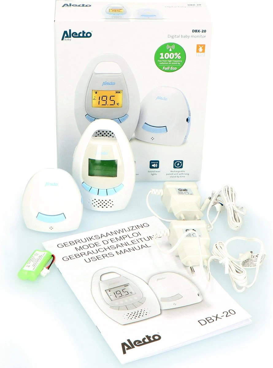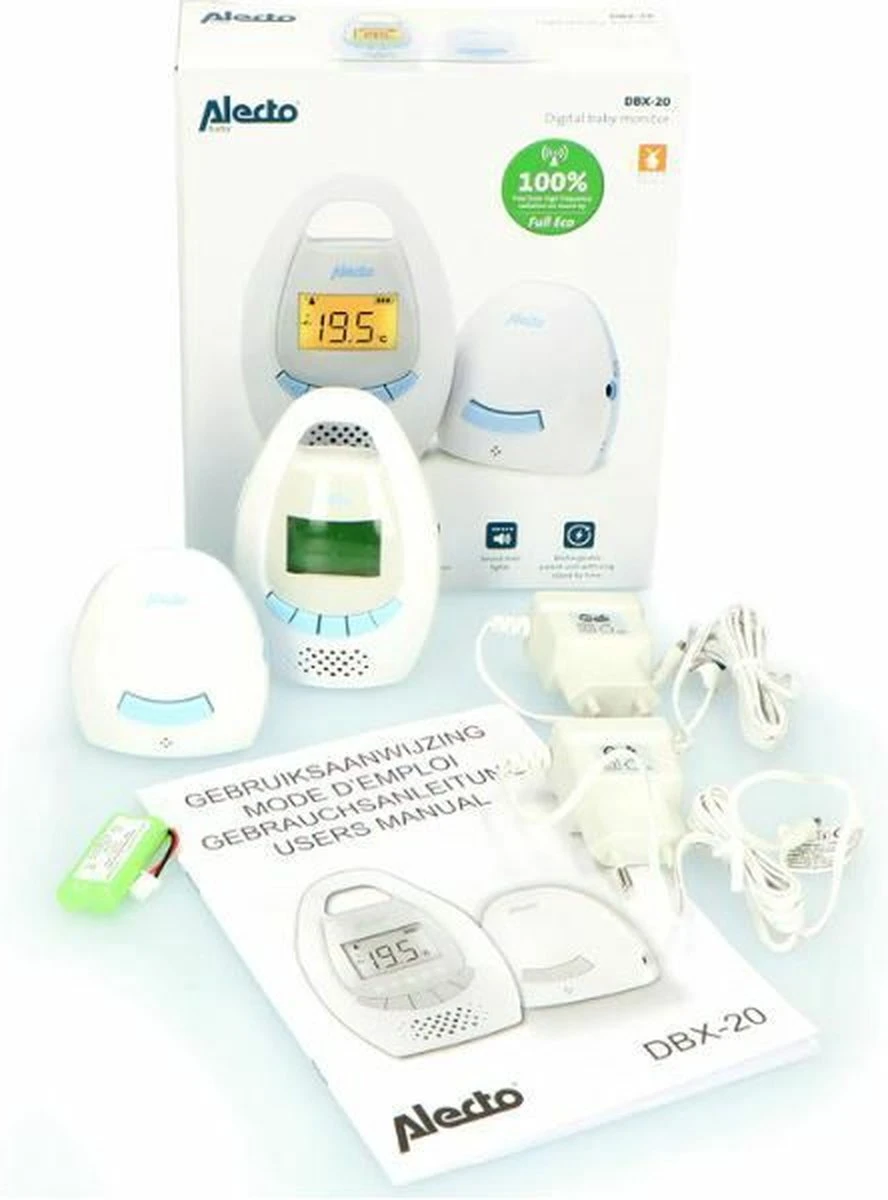 De DBX-20 kent alle voordelen die je van marktleider Alecto’s digitale babyfoons mag verwachten. Dat betekent dat je een perfecte, 100% storingsvrije verbinding hebt met de babykamer. Installatie is simpel: je sluit de babyunit aan in je kindjes kamer en de ouderunit waar je wil. Inschakelen en je bent met elkaar in contact. Een lampje geeft aan dat de verbinding goed is. Als je toevallig een keer buiten het bereik van de babyunit komt zal dit lampje knipperen en waarschuwt een piepsignaal je. Maar met een bereik van 50 meter binnen en 200 meter buiten zal dat niet zo snel gebeuren. En het verbruik is lekker laag: de batterijen houden het tot 12 uur vol. Daarna laad je de ouderunit in 4 uur weer op.