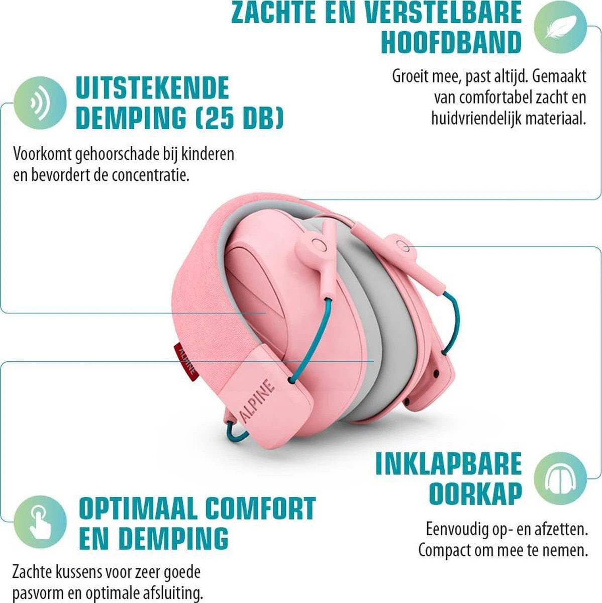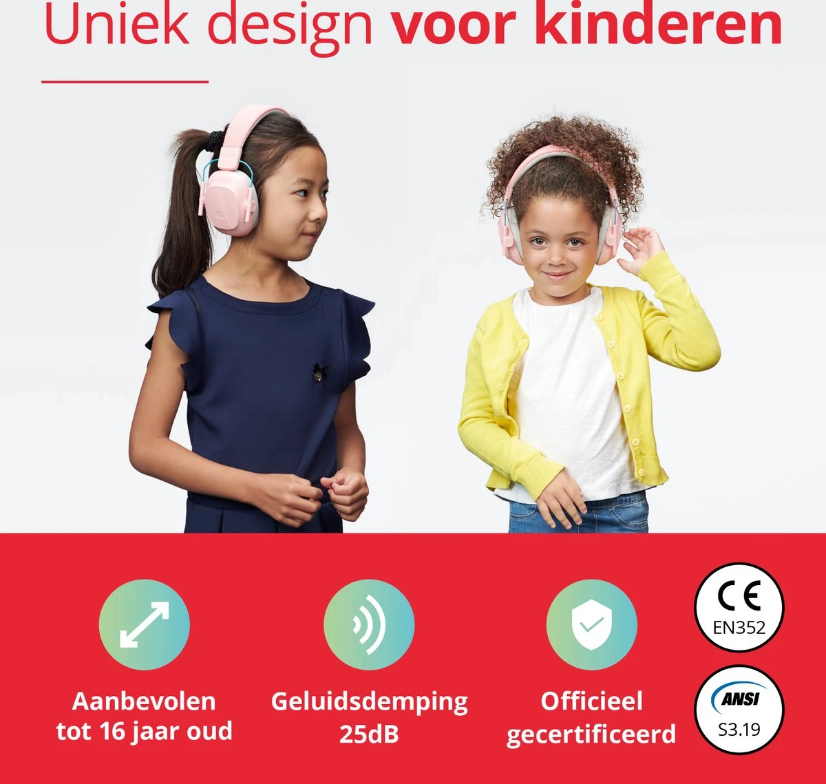 - Speciaal ontworpen voor kinderen. De hoogwaardige materialen zijn zacht, gemakkelijk te reinigen en nog belangrijker: zeer comfortabel. Verstelbare hoofdband zodat ze altijd goed om de oren passen.