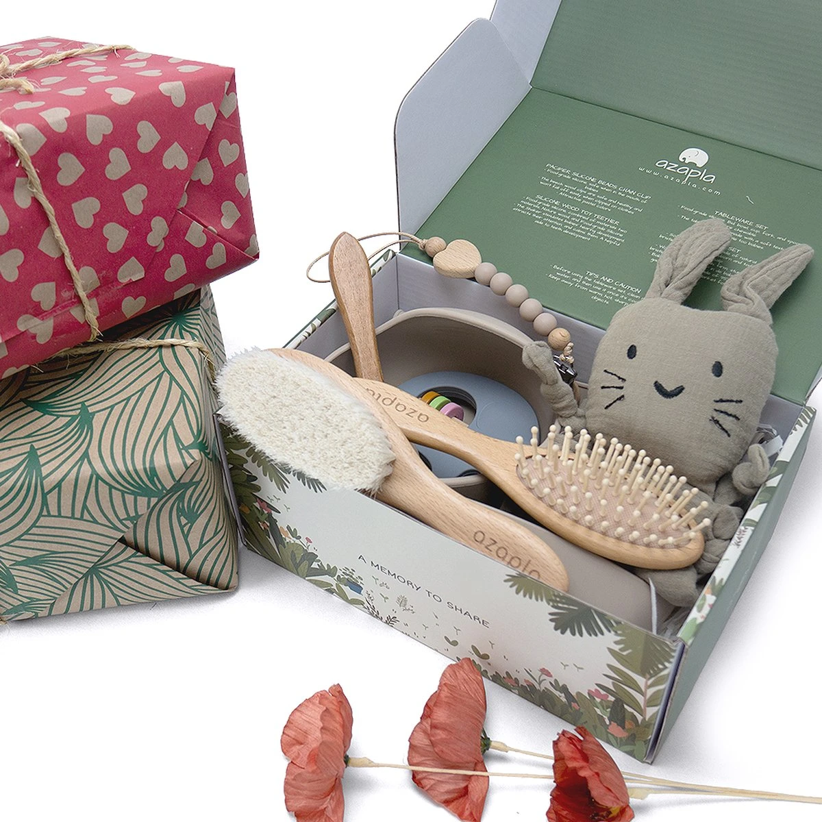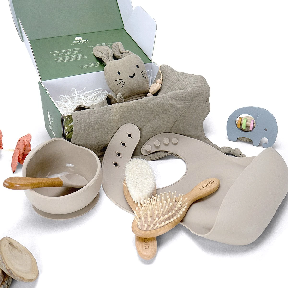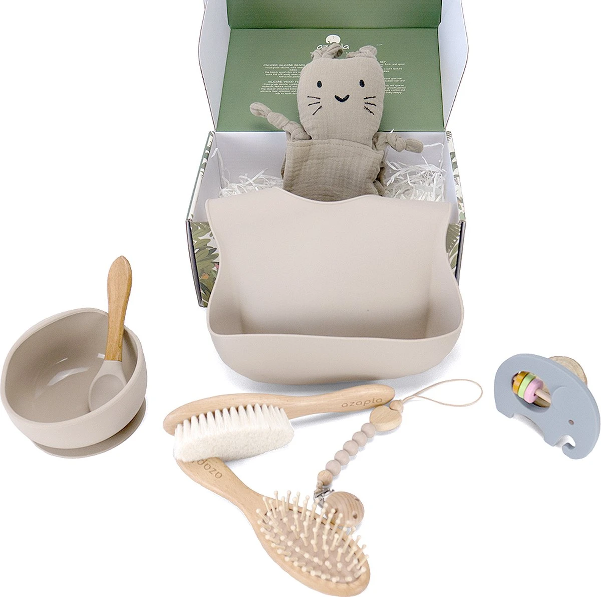 Bij Azapla beschouwen we gezondheid, comfort en design als het middelpunt van onze dienstverlening. We streven ernaar om mooie, veilige en leuke producten te bieden die de liefde die je voor je kind hebt, kunnen omzetten in hun dagelijkse bezigheden. Deze Baby Giftbox” wil precies dat doen op een esthetisch mooie manier. Onze “Baby Giftbox” bevat producten voor de verzorging van je geliefde baby, terwijl ze ook helpen bij hun entertainment en ontwikkeling. Met onze BPA-vrije plastic banden en gehaakte speeltjes kun je er zeker van zijn dat je baby geniet van zijn nieuwe momenten in deze wereld.