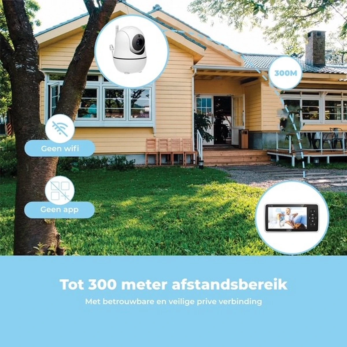De ouderunit heeft een kleuren beeldscherm van maar liefst 12,5 cm. De babyfoon bevat een oplaadbare batterij waarmee het scherm 8 uur continu aan kan blijven staan. Wanneer uw kleintje onrustig is, zoomt u gemakkelijk in. U kunt ook de schermhelderheid aanpassen. De babyfoon heeft een bereik binnen tot 50 m en buiten tot wel 300 meter!