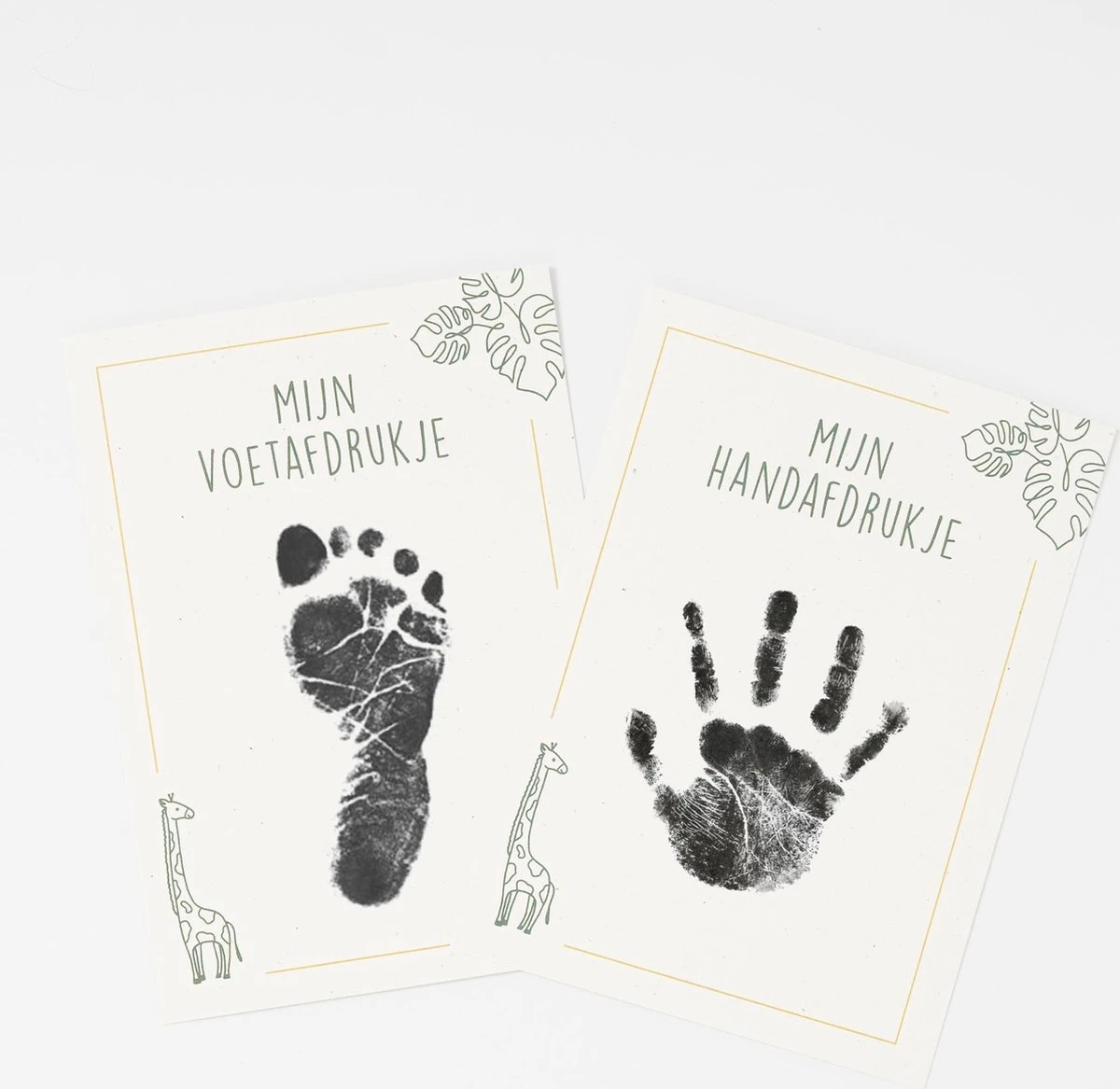 - 2 kaartjes waar je een voet- en een handafdrukje op kunt maken met verf of inkt.