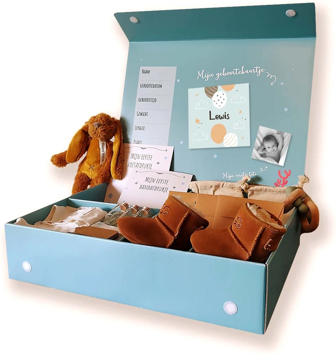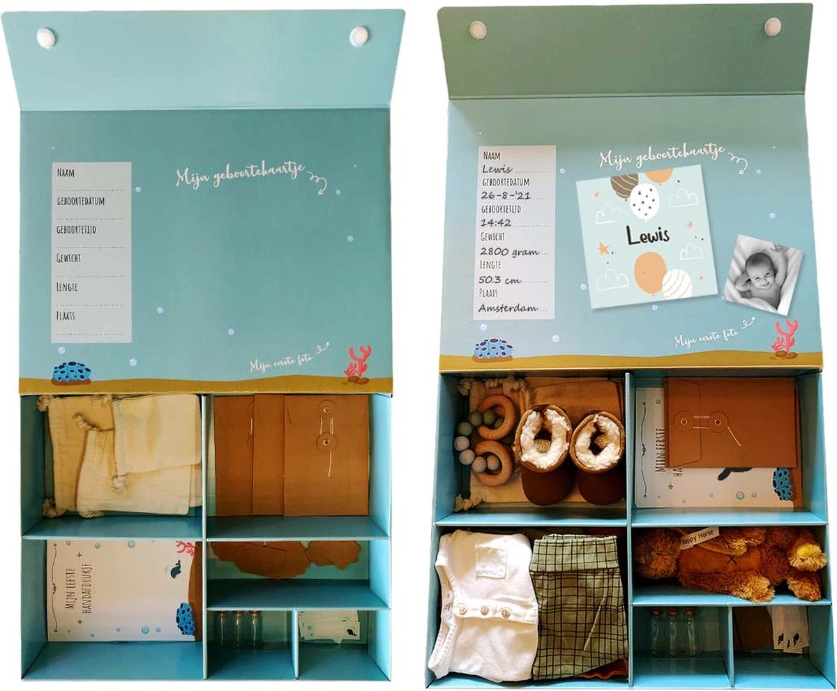 (Ter verduidelijking: Sommige foto’s zijn bedoelt voor inspiratie en bijvoorbeeld de knuffel, bijtring, schoentjes en outfitje zichtbaar op de foto’s zijn niet inbegrepen. Alleen hetgene beschreven bij de inhoud van de doos is inbegrepen. Het is de bedoeling dat je de Memory Box zelf vult met allerlei speciale spulletjes/herinneringen die voor jou belangrijk zijn!)