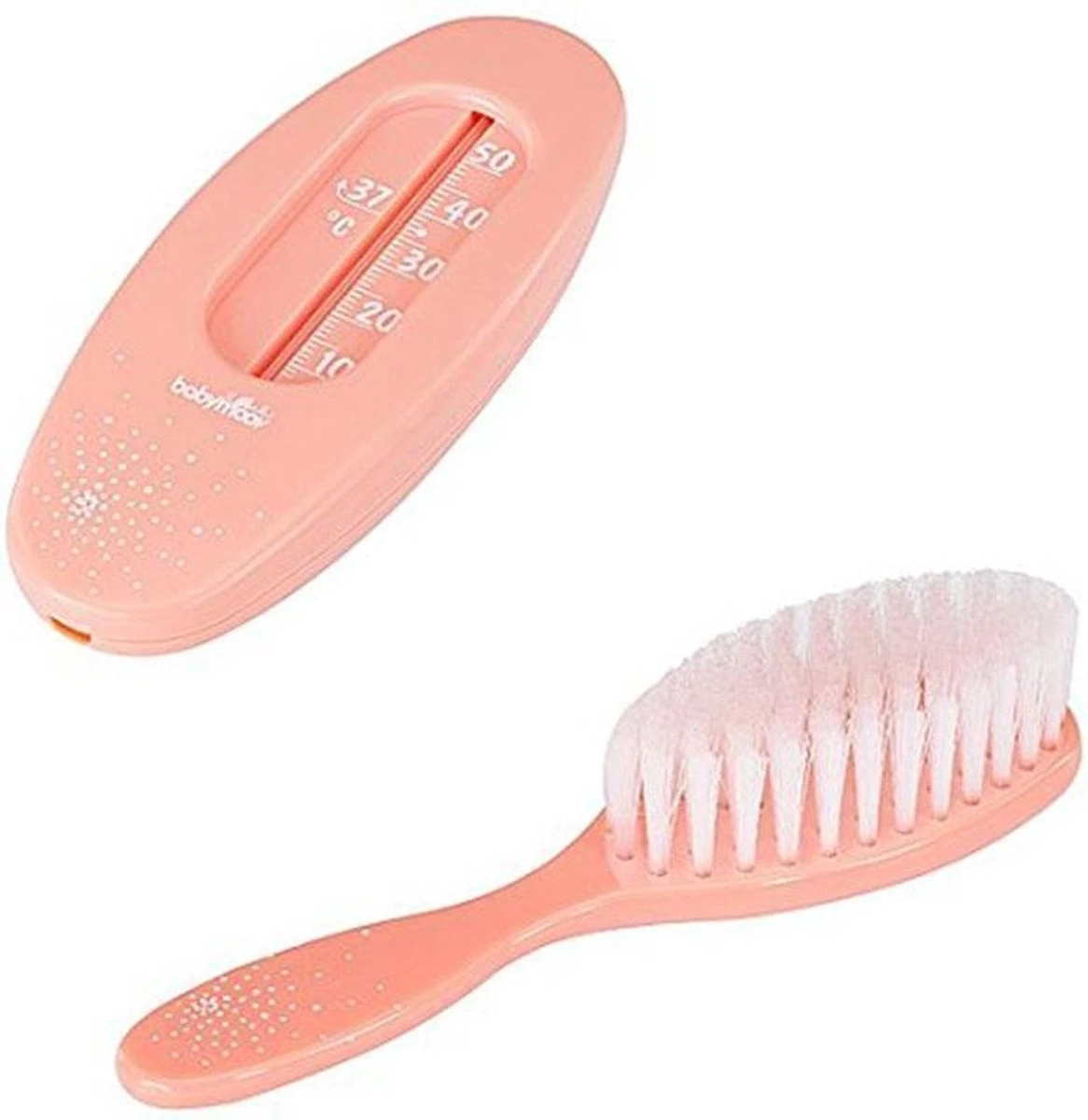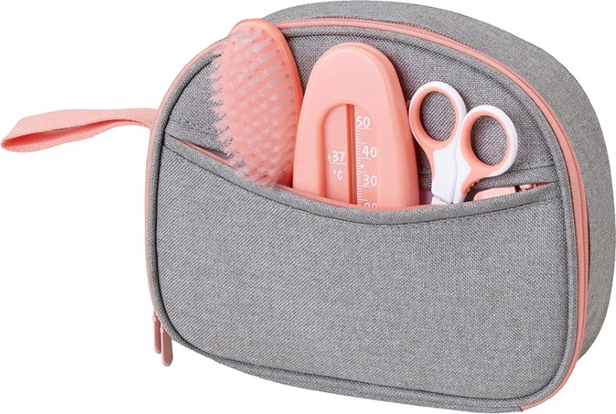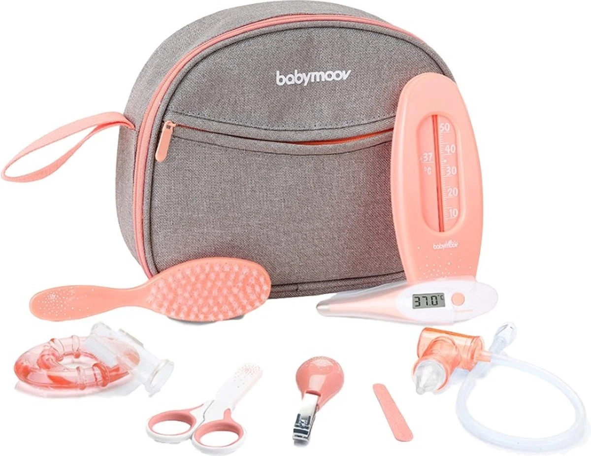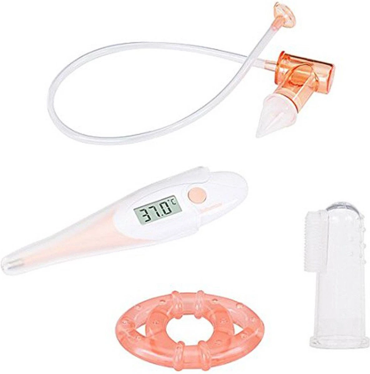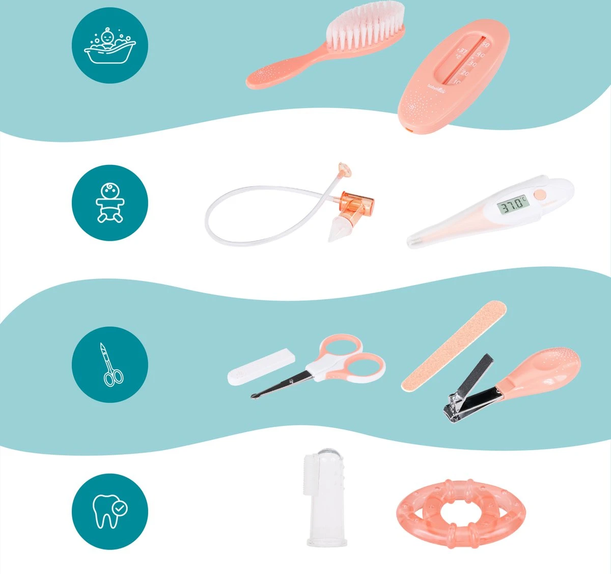 Het setje bestaat uit: een digitale thermometer, een schaartje, een nagelknipper, een vijl, een neusreiniger, een borstel, een bijtring, een thermometer voor badwater en een opbergtasje.