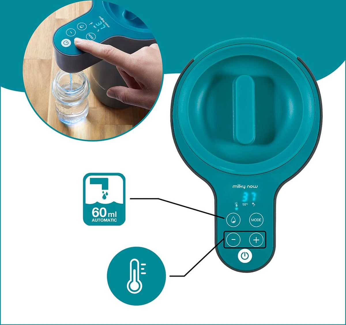 Met de Babymoov Milky Now flessenbereider kan je op een makkelijke en snelle manier de flesjes van je kind bereiden. De flessenbereider heeft 3 handige functies (water warmhouden, 100 °C, Clean) waardoor je het flesje makkelijk kan opwarmen, de veiligheid kan garanderen en makkelijk kan reinigen.
