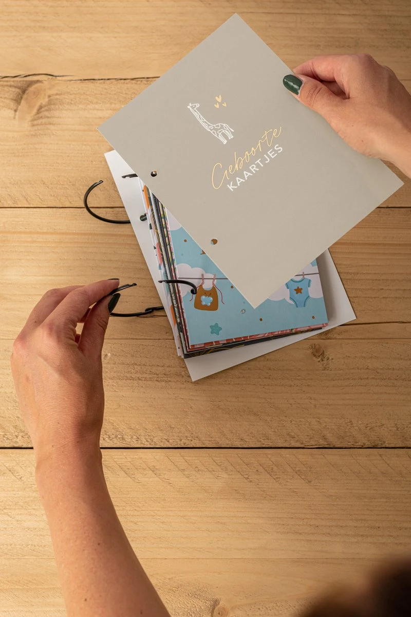 Bewaar alle kaartjes die je hebt gekregen voor de geboorte op een nette en leuke manier bij elkaar in deze bewaarbundel van Great Memories. Het luxe, stevige papier is bedrukt met goudfolie wat een speciaal effect geeft.