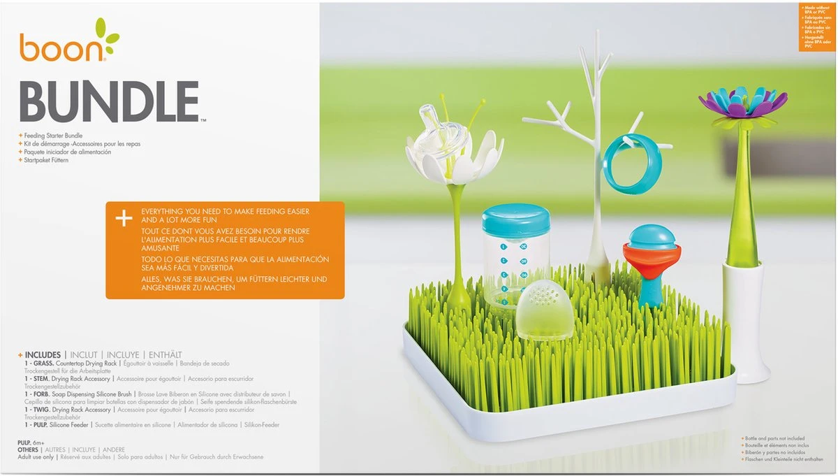 Het BOON Bundle Starterspakket is speciaal ontwikkeld voor het schoonmaken van babyvoedingsartikelen. Deze complete set heeft een uniek design dat past in iedere moderne keuken In deze set vind je de vier BOON favorieten. De BOON Pulp siliconen voedingslepel is de perfecte plek voor fruit, groenten en ijs. Deze lepel biedt je baby de mogelijkheid om zelfstandig te eten op een gemakkelijke en rommelvrije manier. Het BOON Grass Afdruiprek dient voor het drogen van allerlei babyvoedingsartikelen. De spulletjes rusten in het gras, terwijl het water in het onderliggende opvangbakje druipt. De BOON Stengel en Twig accessoires zet je in het gras en dienen om kleine afgewassen spulletjes aan te hangen, terwijl je de vrije ruimte onderaan voor het drogen van grotere items benut. BOON Forb Afwasborstel heeft de vorm van een vrolijke bloem en is een afwasborstel met zeepdispenser die helpt om alles schoon te houden.Met een kneep in het handvat beschik je steeds weer over de juiste hoeveelheid afwasmiddel. De Forb heeft een handige houder. Alle BOON artikelen zijn gemaakt zonder BPA en PVC.