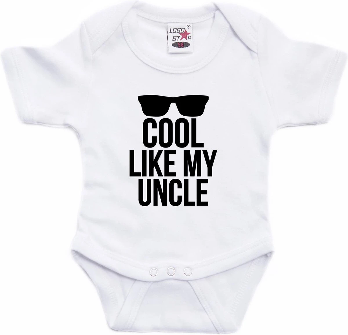 Cool like my uncle kado tekst baby rompertje wit voor jongens en meisjes. Op dit witte rompertje staat een zwarte zonnebril en de tekst: Cool like my uncle. Deze romper is leuk om cadeau te geven bijvoorbeeld als kraamcadeau van oom, of om aan te trekken bij uw kleine als die gaat logeren bij een oom.