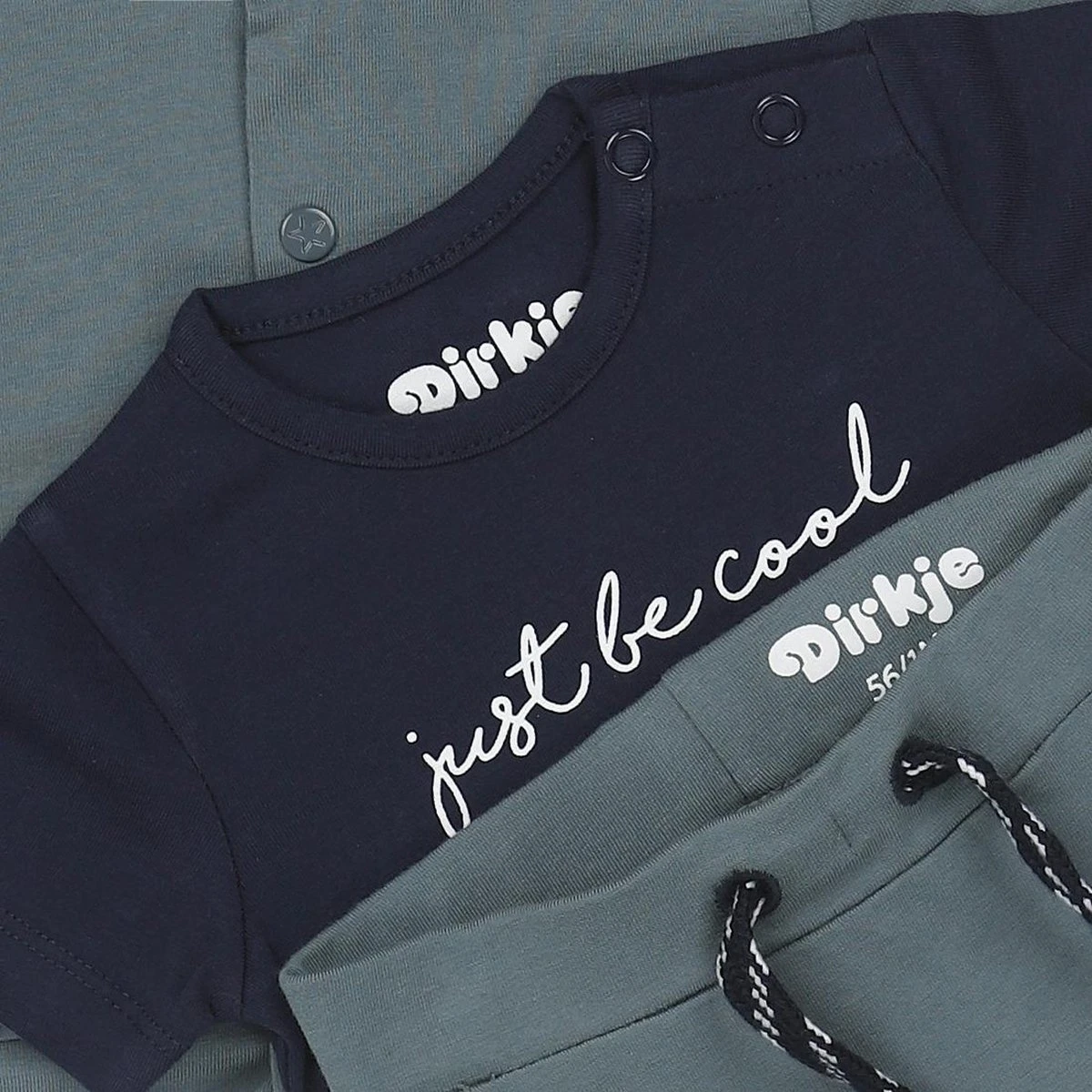 3-delig babysetje van Dirkje voor jongens. Dit setje is gemaakt van biologisch katoen en het vestje en de broek zijn dusty green van kleur. Beide bevatten dusty green met off-white gestreepte ribboorden. Het shirtje is navy en bevat de test ”just be cool” in het off-white.
