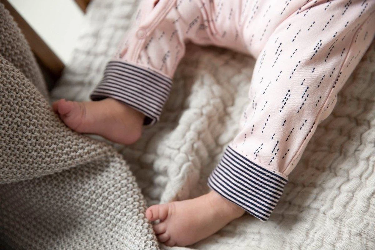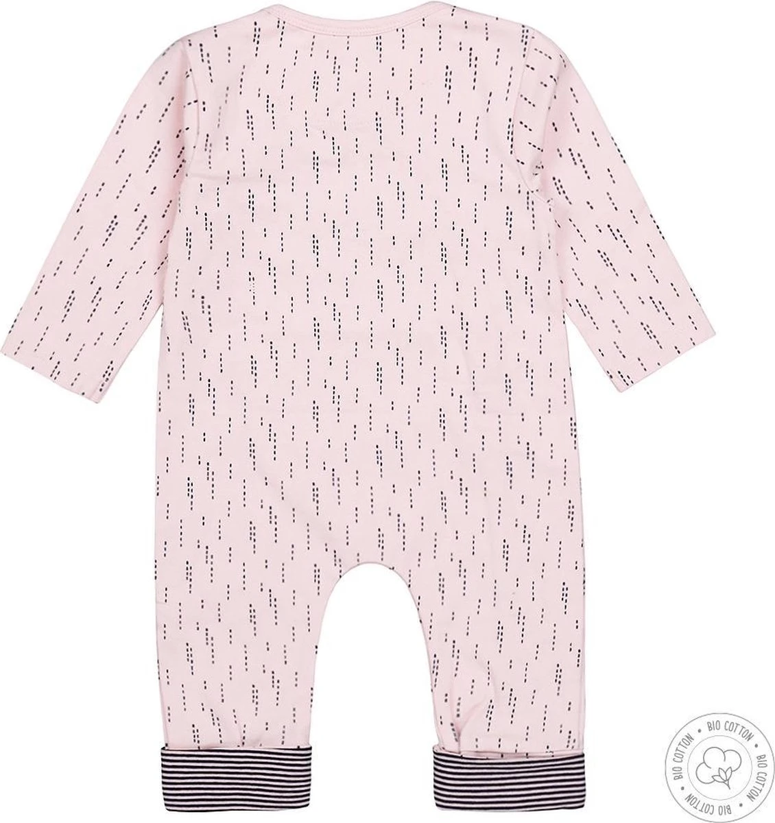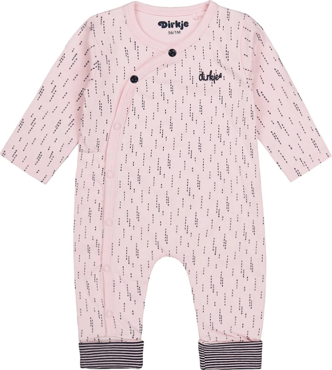 Dirkje babypakje voor meisjes. Dit licht roze pakje is gemaakt van biologisch katoen. Onderaan het broekje zit een omslagboord met een navy met licht roze horizontaal gestreepte binnenkant.