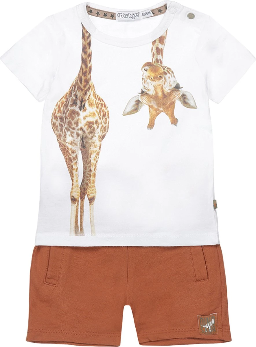 Leuk 2-delig Dirkje setje voor jouw kleine dierenvriend! Dit setje bestaat uit een jogging shorts en een t-shirt. Het t-shirt is wit van kleur en heeft een print van een giraf op de voorkant. Het broekje is wat roestig van kleur.