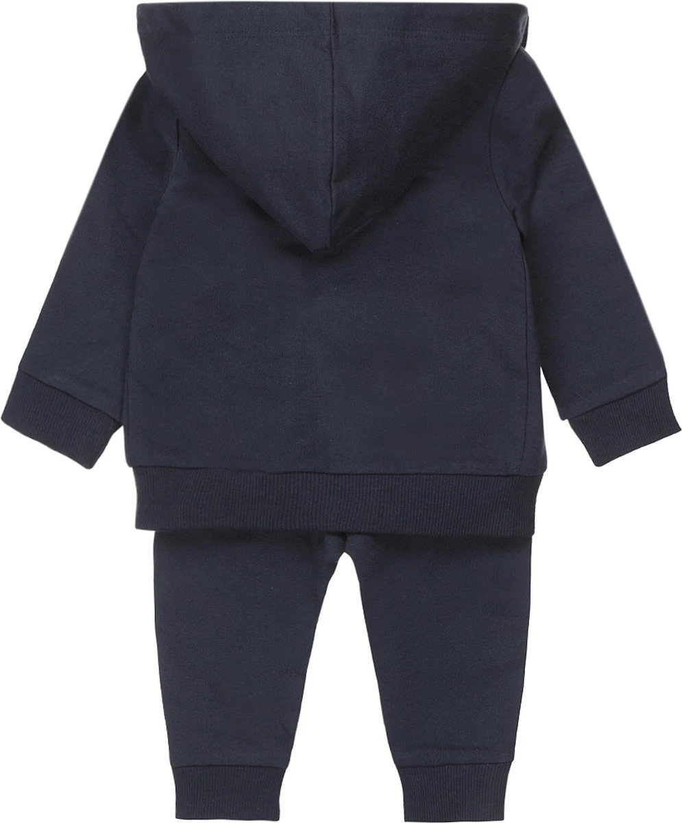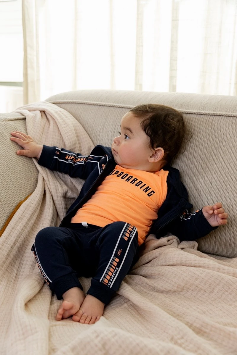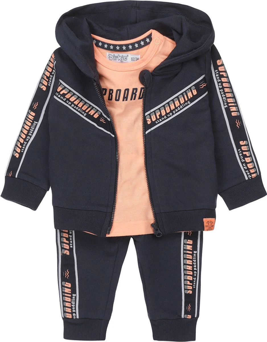 Stoer en opvallend 3-delig setje van Dirkje. Dit jongens setje bestaat uit een vest, t-shirt en joggingbroek. Het vest en de broek zijn navy van kleur en hebben opvallende tapes. Deze tapes zorgen er voor dat het trainingspak perfect matcht met het perzik gekleurde shirtje.