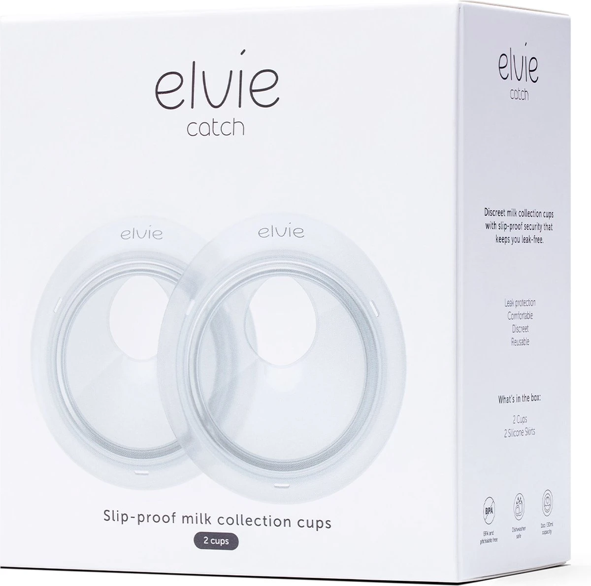 De Elvie Catch is een set van twee borstschelpen met beveiliging tegen het uitlopen van melk en om lekken te voorkomen. Zelfs als je last hebt van veel weglekkende melk, zal de Elvie Catch toch elke druppel melk discreet opvangen in je bh.