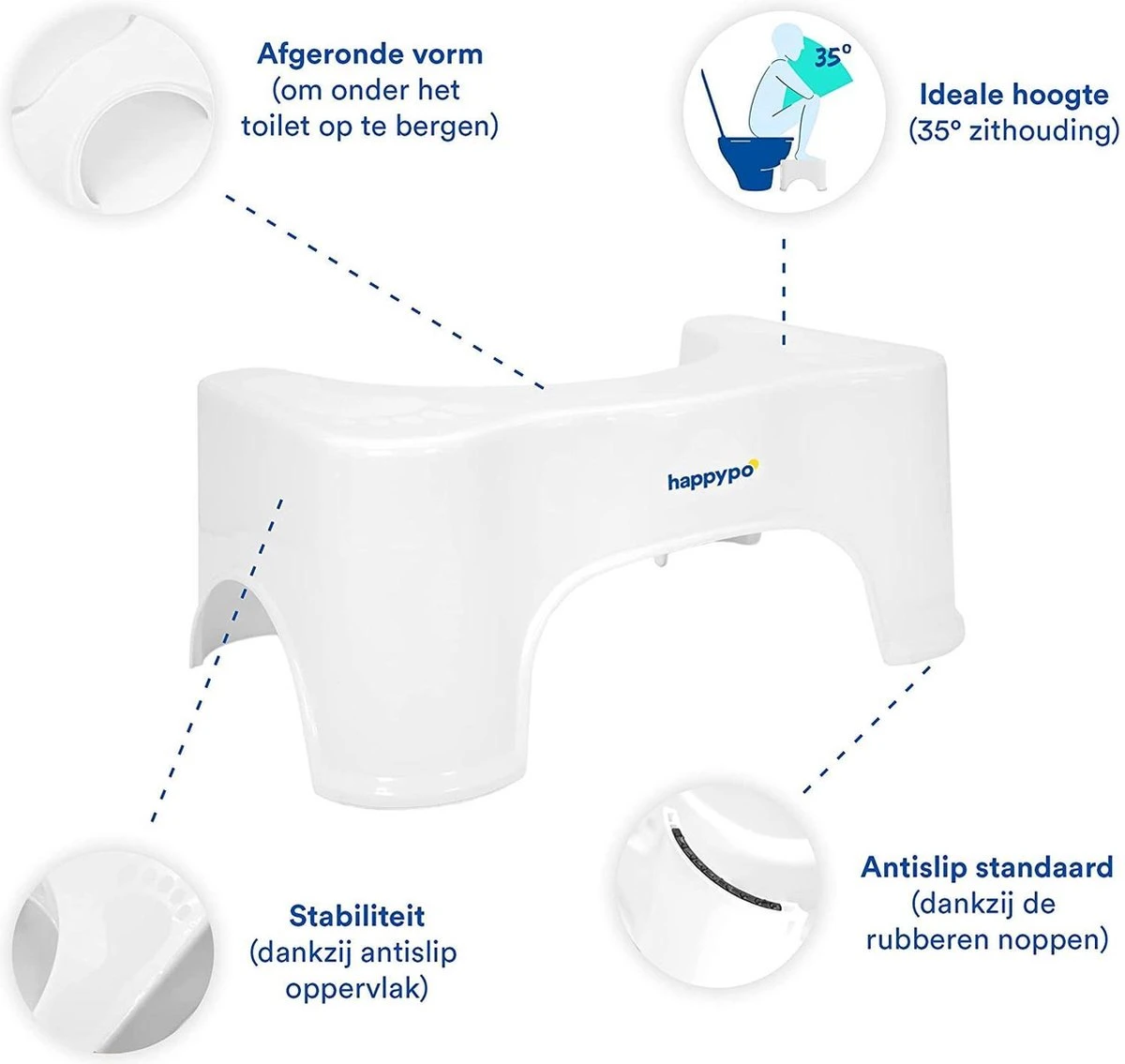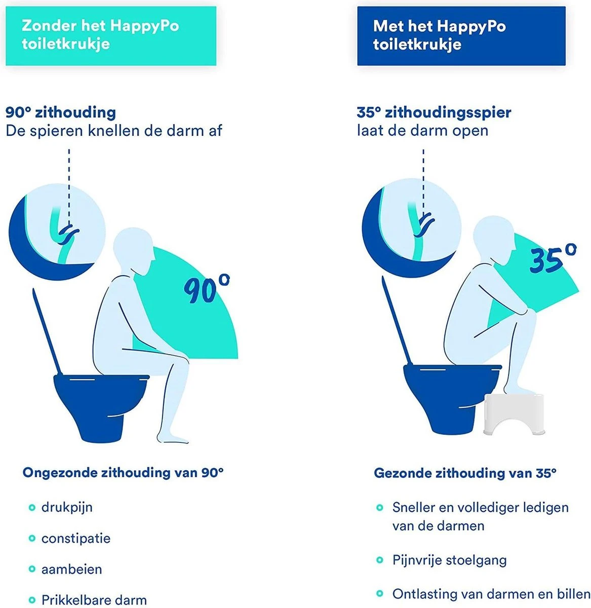 - DE ORIGINELE HAPPYPO POEPKRUK – Ondersteunt de door artsen aanbevolen perfecte houding, hurkend in een hoek van 35°. De anatomisch gezonde zithouding bij het poepen met krukje bevordert een gemakkelijkere en snellere stoelgang.
