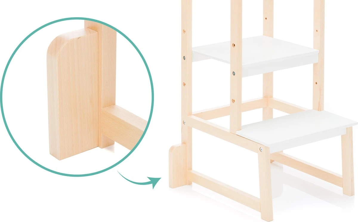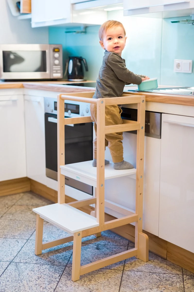 En, omdat onze kleintjes zo snel opgroeien, kan de hoogte van de standaard perfect worden aangepast aan de huidige lengte van het kind. Zo kan uw kindje overal meehelpen, of het nu gaat om koken, bakken of zelfs tandenpoetsen, deze toren is een optimaal opstapje om overal veilig bij te kunnen.