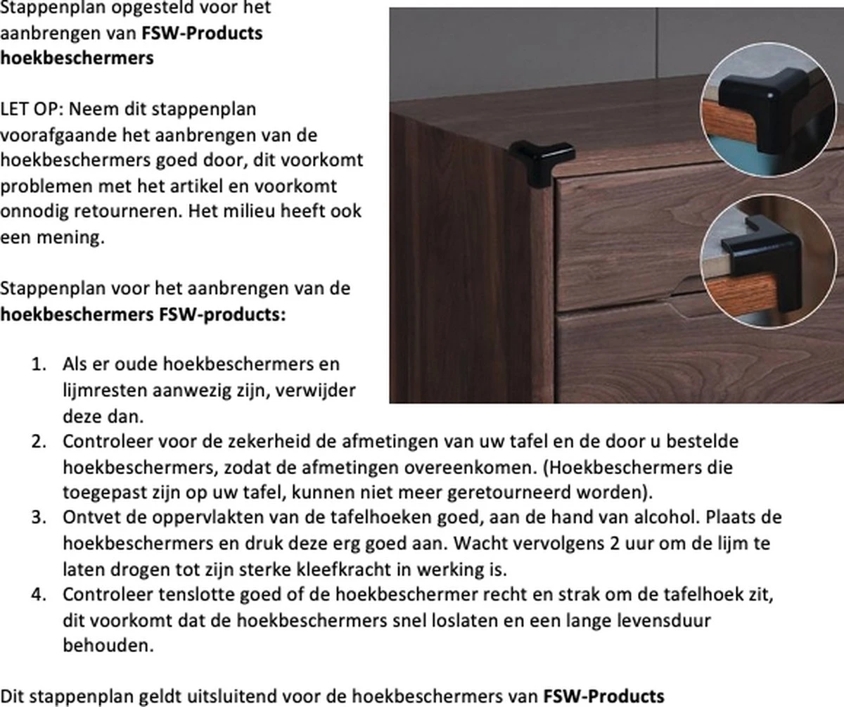 – Na het plaatsen van de tafelhoeken, raak deze de komende 24 uur niet aan. Dit zorgt ervoor dat de tafelhoeken goed blijven zitten.