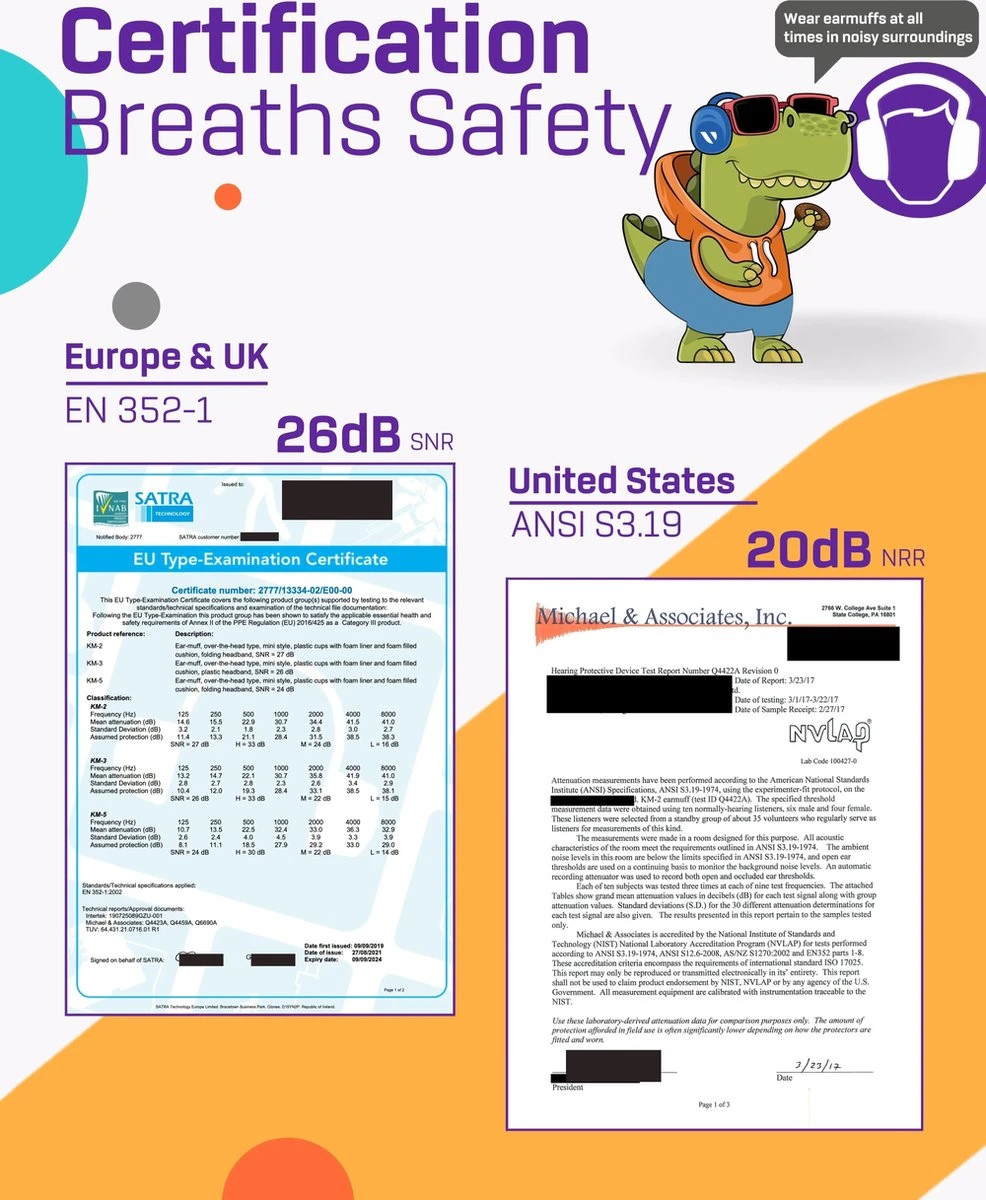 Sommige brands zijn niet, of niet volledig, gecertificeerd. Vanderfields is gecertificeerd volgens de CE EN352-1 richlijnen met een SNR van 26dB. Daarnaast voldoen we aan de Amerikaanse ANSI S3.19 Richtlijnen met een NRR van 20dB.
