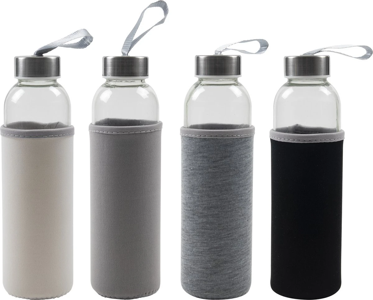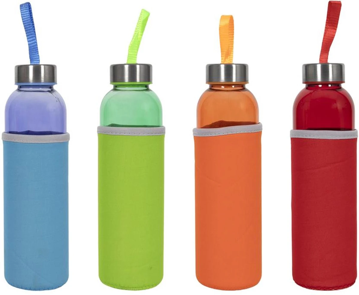 Glazen Fles – To Go – Inclusief Hoes – 500 ML – 4 Stuks