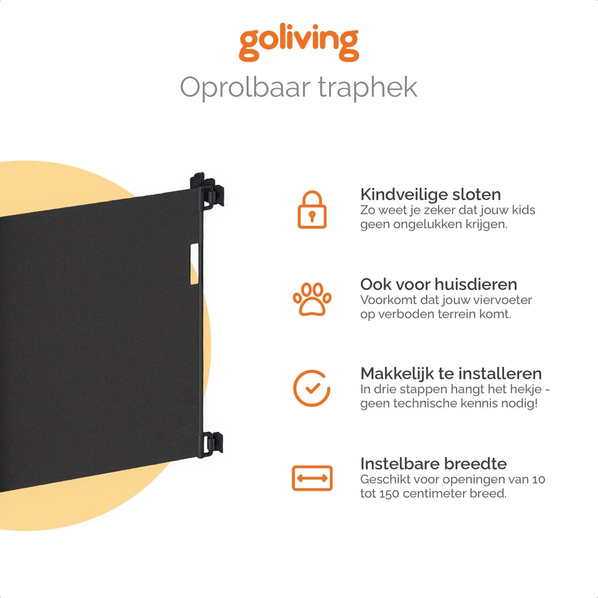 Dit handige traphekje van Gologi is ontzettend veelzijdig. Door het oprolbare design kun je dit veiligheidshekje op veel verschillende plekken inzetten. Of je nu een smalle doorgang wilt blokkeren of een brede trap: het Gologi traphekje is 80 centimeter hoog, en uit te rollen van 10 tot maar liefst 150 centimeter breed.