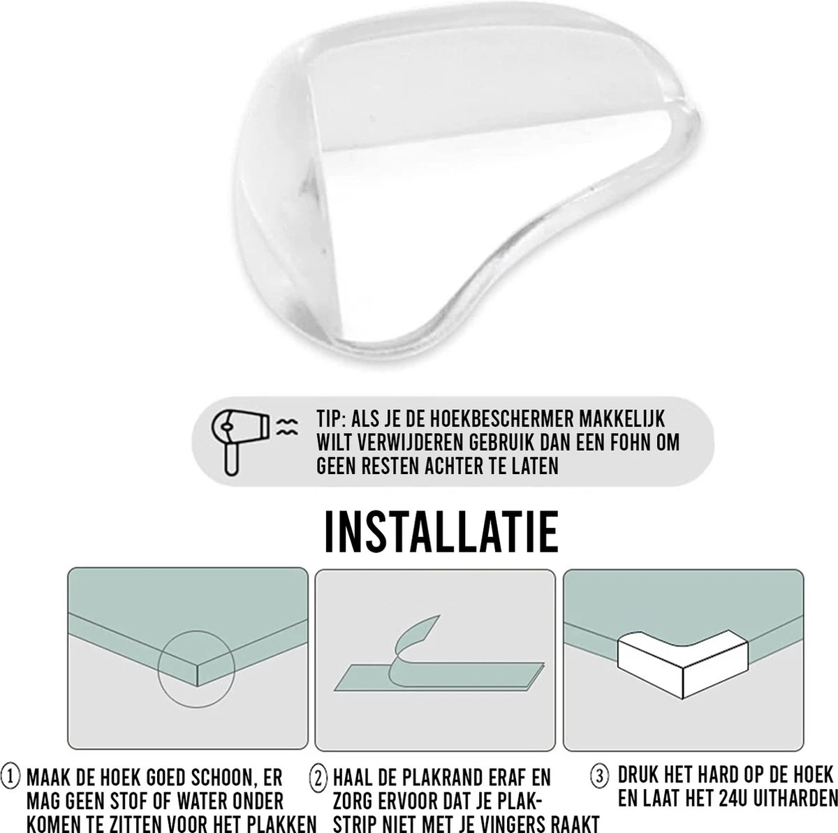 De beschermers zijn in een minuut geïnstalleerd. Maak de hoek van het meubel goed schoon. Er mag geen stof, water of vuil onder zitten. Haal de plakrand eraf. Zorg ervoor dat je de plakstrip niet met je vingers aanraakt. Druk de hoekbeschermer aan en laat 24 uur uitharden. Tip: als je de hoekbeschermer makkelijk wil verwijderen, gebruik dan een föhn om geen resten achter te laten.