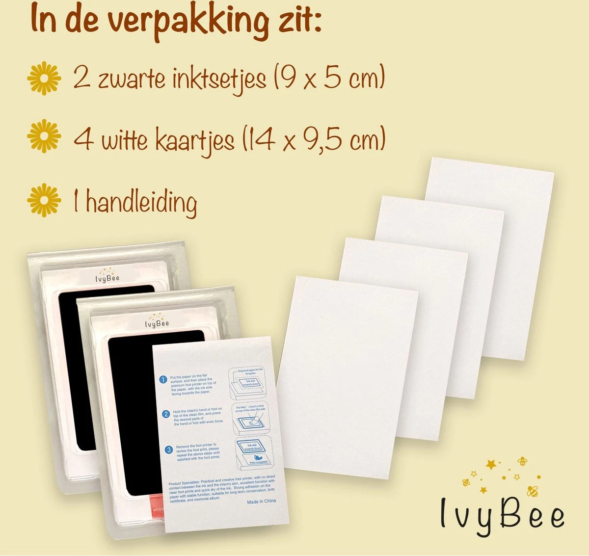 Bij levering ontvang je een stencilpapier en twee witte kaartjes voor het maken van een afdruk van zowel de hand als de voet.
