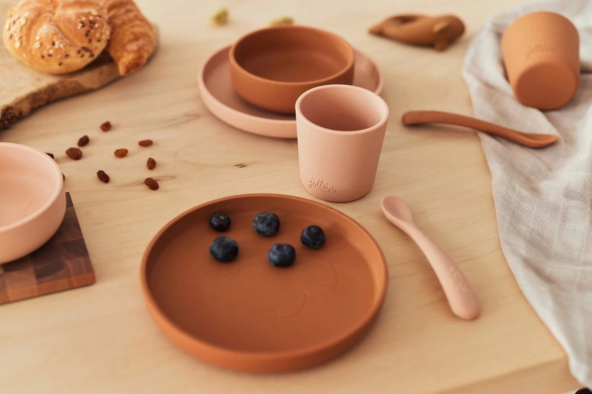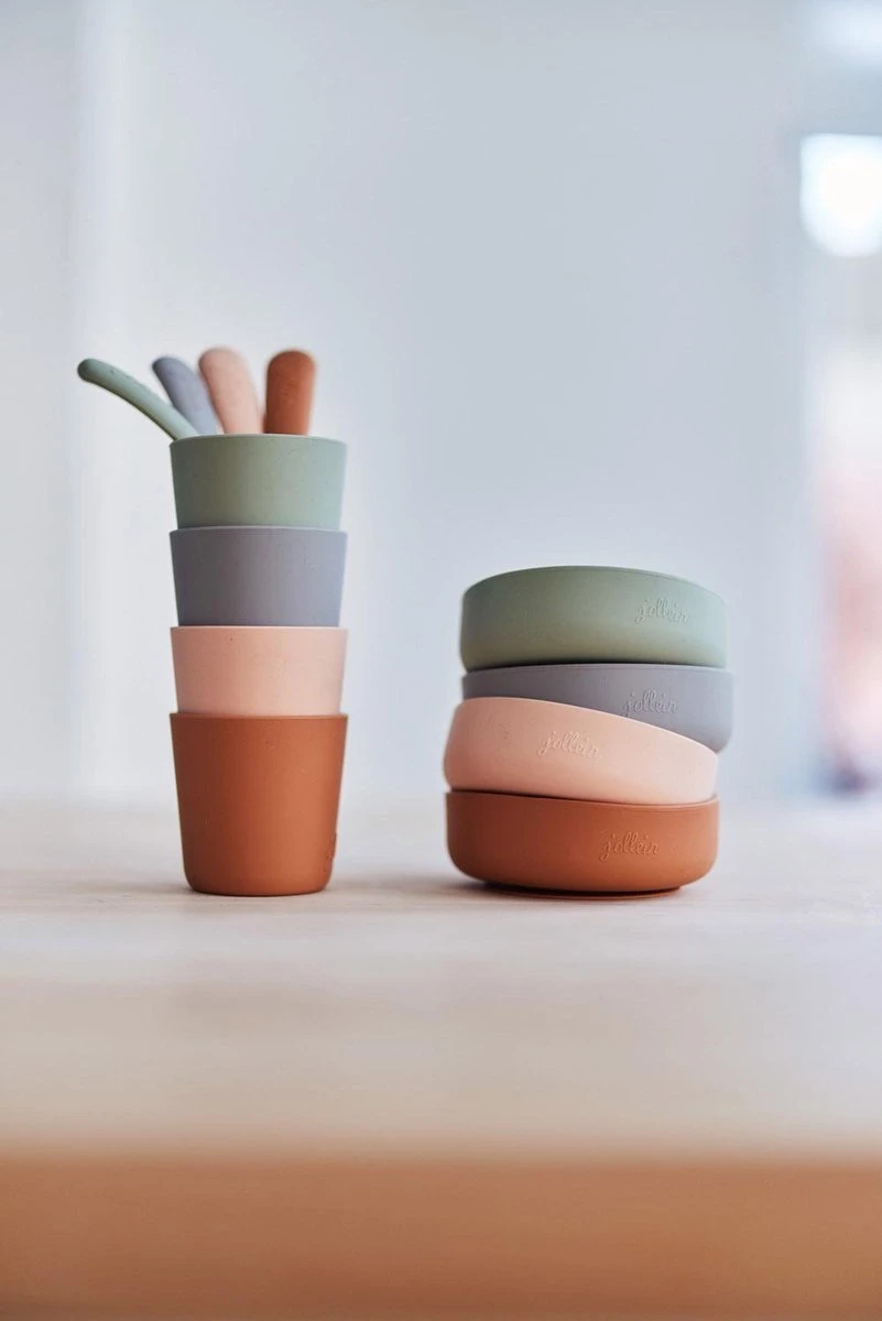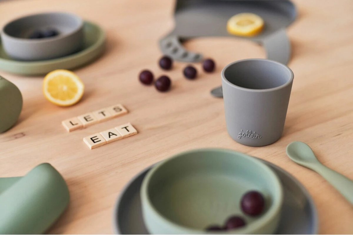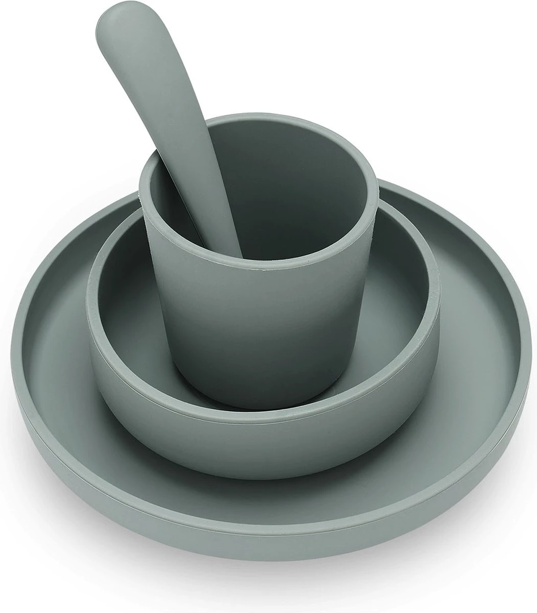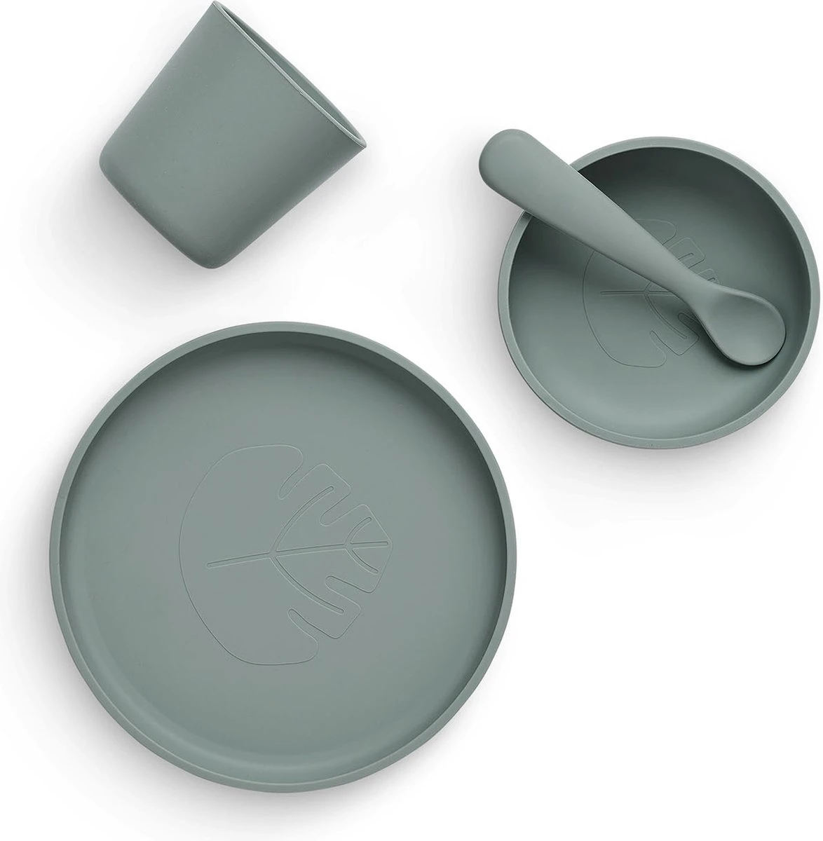 Het gehele kinderserviesset bestaat uit een bord, beker, kommetje en lepel en zijn gemaakt van 100% siliconen. 100% vrij van BPA, PVC, en PHTHALATES.