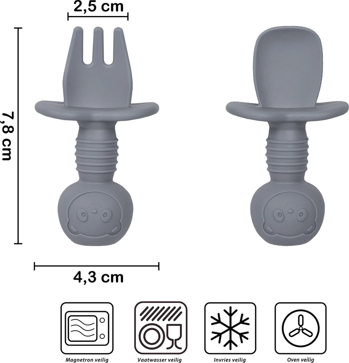 1x een grijs JU&MP anti-stik babylepeltje en vorkje
