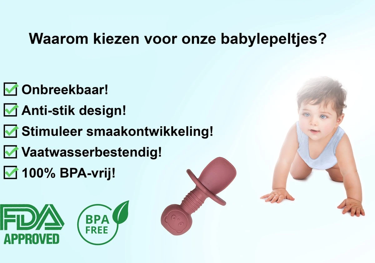 Onze producten zijn gemaakt van de beste kwaliteit FDA goedgekeurde siliconen en zijn 100% vrij van BPA, PVC, lood en andere giftige stoffen die schadelijk zijn voor uw kind. De babylepeltjes en -vorkjes zijn tevens resistent tegen geur, vlekken en bacteriën. De bestekset is bestand tegen temperaturen van -40°C tot 240°C en dragen geen warmte over.