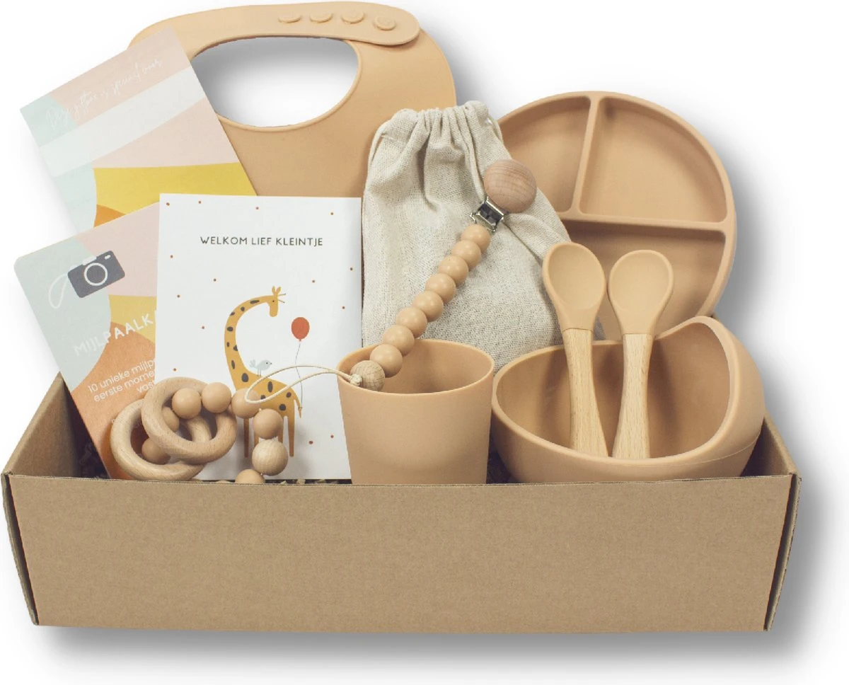 In de giftbox L zit een stijlvolle silicone eetset, een bijtring en een speenkoord. Je krijg een wenskaart meegeleverd, zodat je een persoonlijke wens achter kunt laten. In de giftbox zit ook een set milestone kaarten, om de eerste bijzondere momenten van het kleintje vast te leggen.
