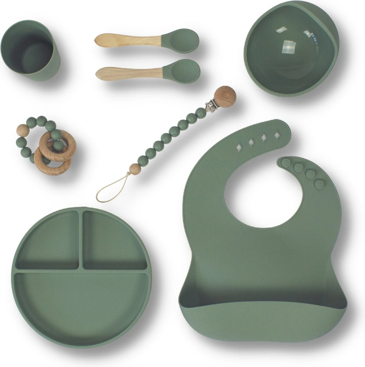 De producten in de giftboxen worden gemaakt van een hoogwaardige kwaliteit silicone. De bijtring en het speenkoord bevatten beukenhout en touw. De speenkoord bevat ook loodvrij metaal.