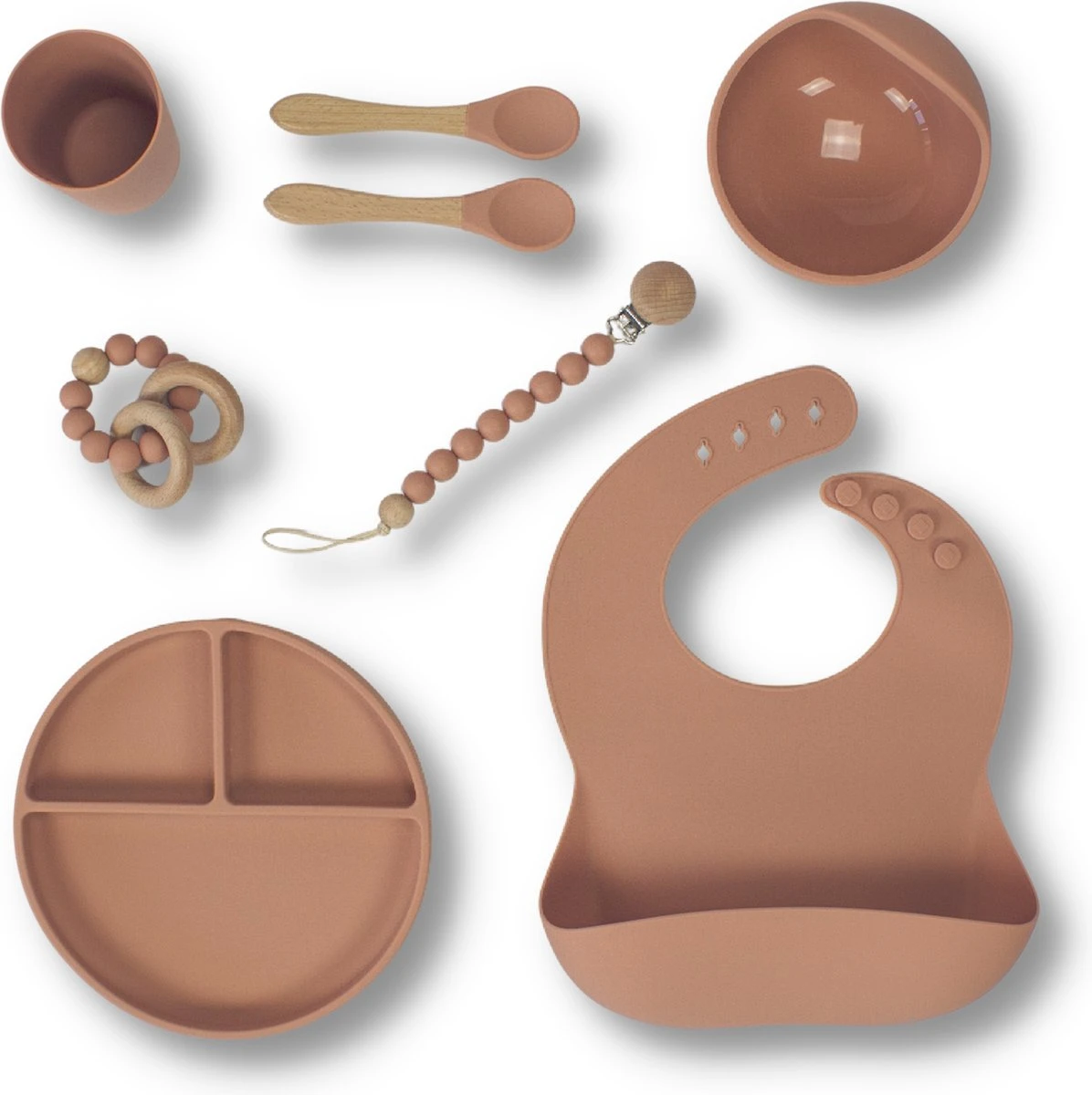 De producten in de giftboxen worden gemaakt van een hoogwaardige kwaliteit silicone. De bijtring en het speenkoord bevatten beukenhout en touw. De speenkoord bevat ook loodvrij metaal.
