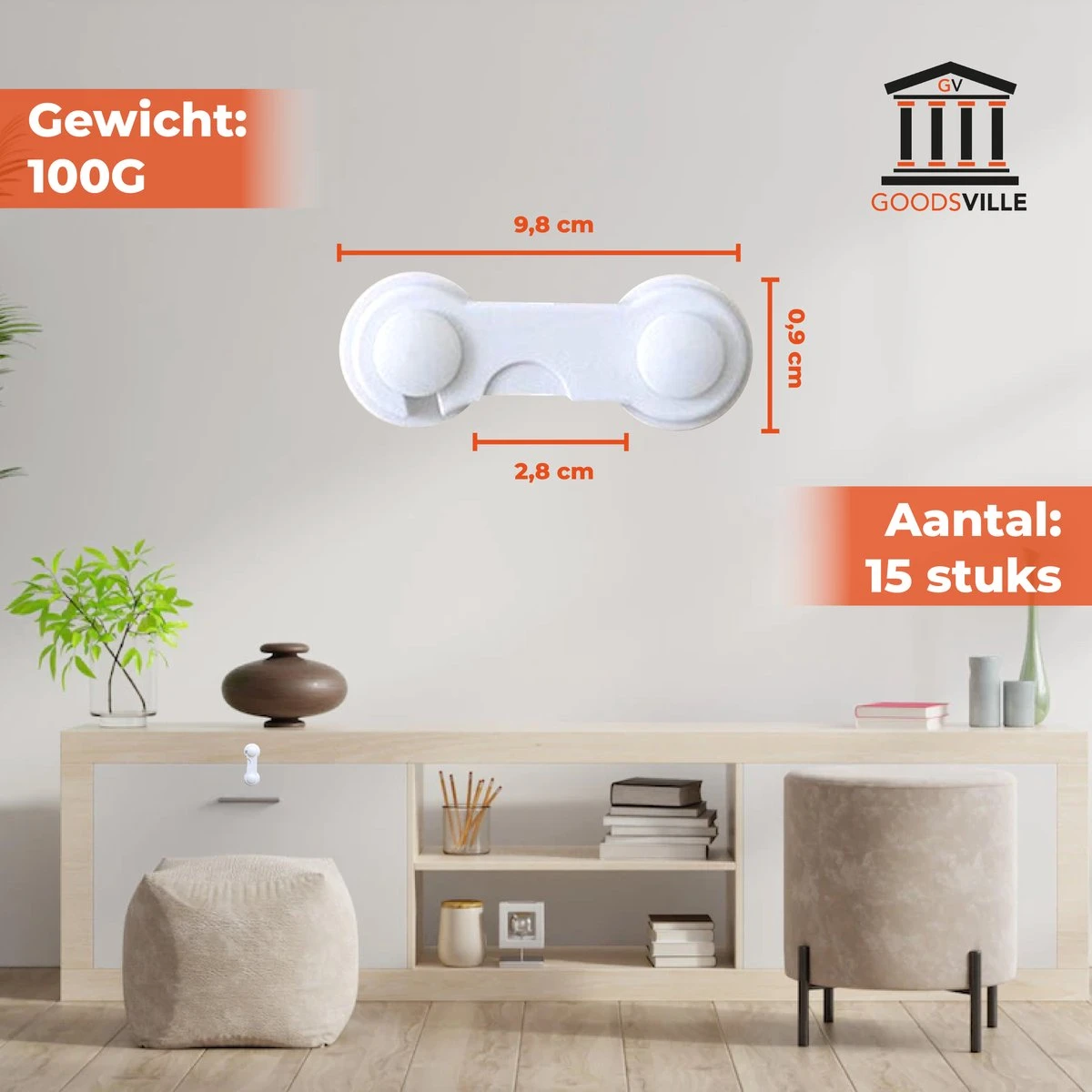Onze Kindersloten worden geleverd in pakketten van 15 stuks; genoeg sloten om elke gevaarlijke situatie veilig te maken!