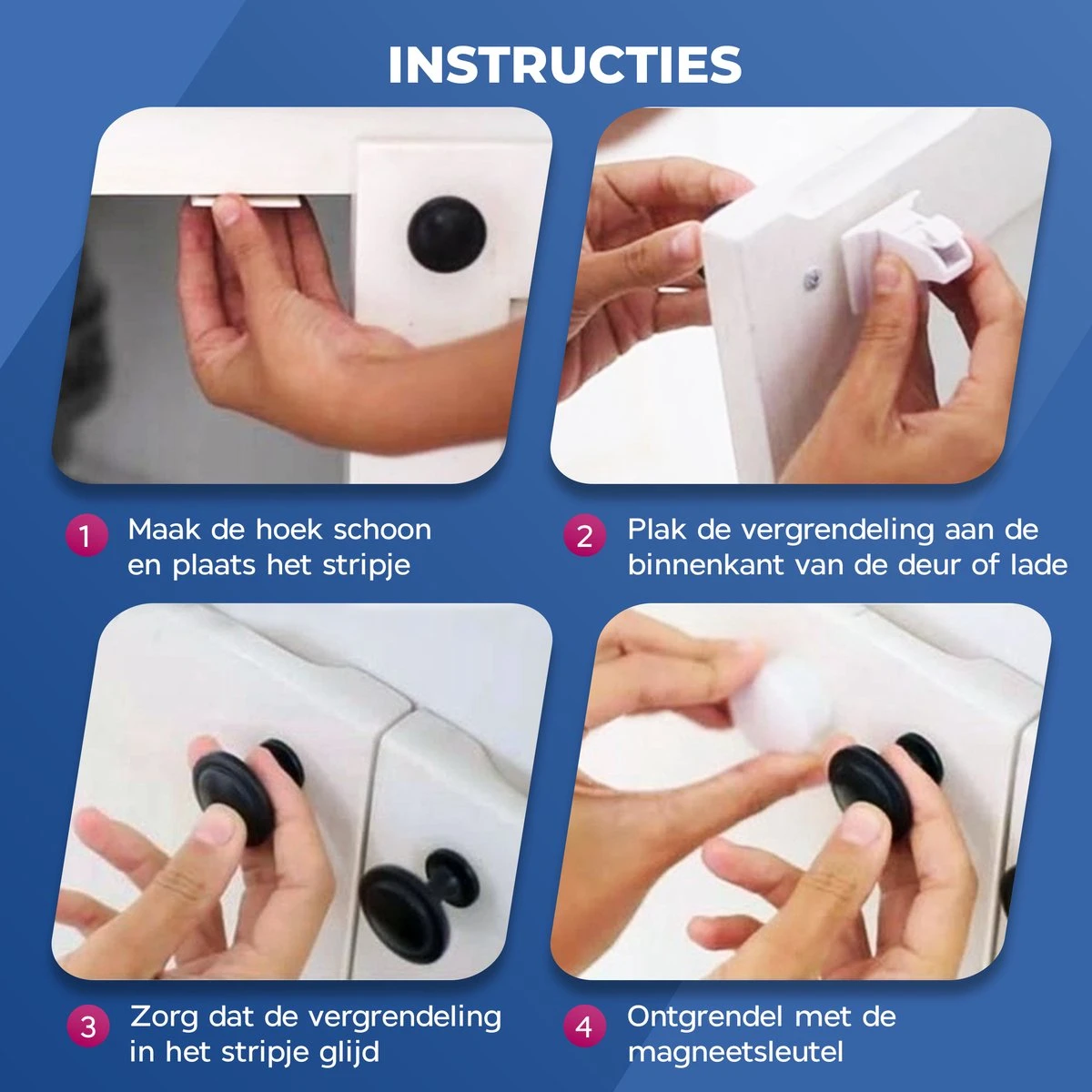 De installatie van deze kindersloten is heel eenvoudig en kost maar 5 minuten door gebruik te maken van de stappen hieronder: