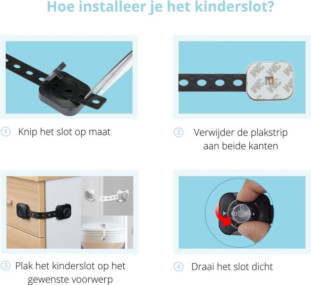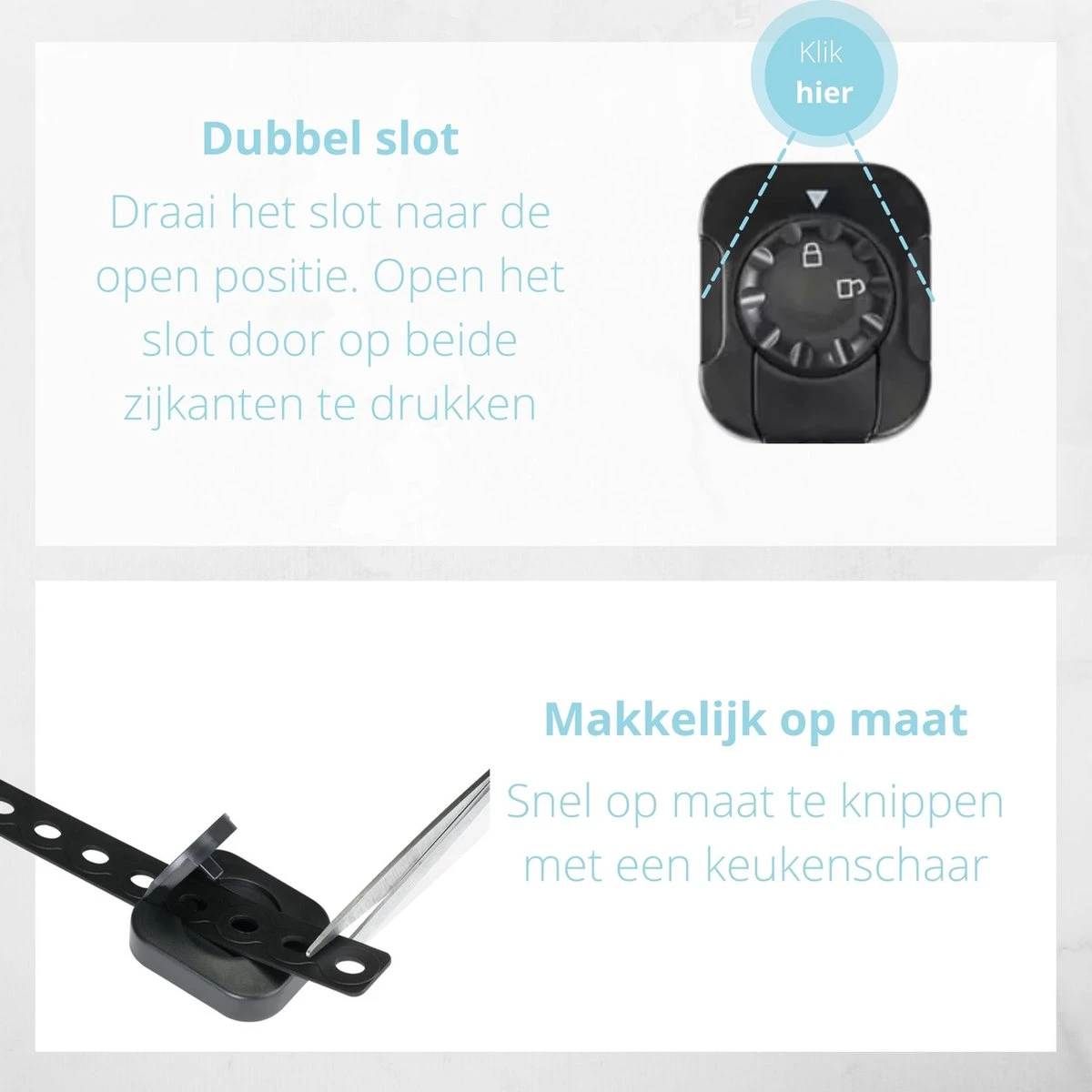 Je kunt het slot makkelijk op maat knippen met een keukenschaar. Hierdoor is het slot op allerlei huishoud objecten en meubels te gebruiken!