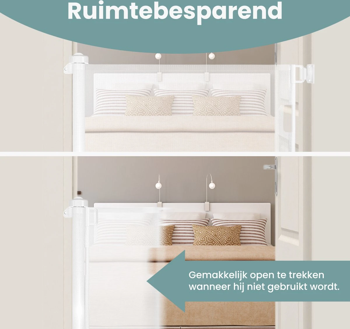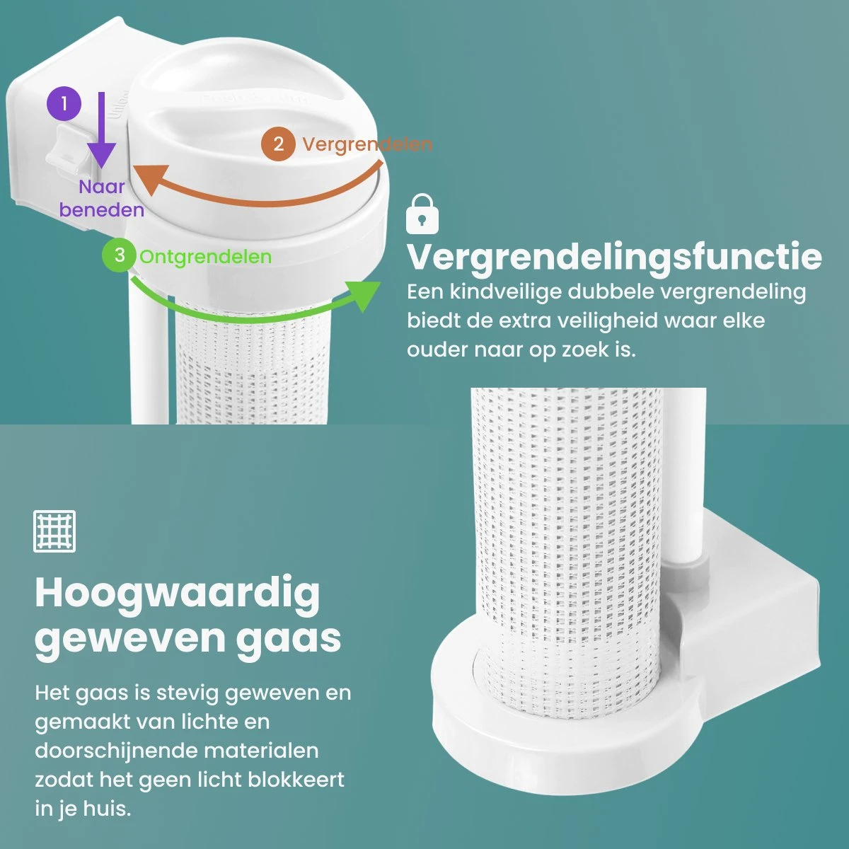 Jouw nieuwe traphekje is voorzien van een slim design en rolt zichzelf automatisch op wanneer de spanning van het slot wordt verwijderd, hoe handig is dat! Zo berg je het hekje compact en netjes op na gebruik en maak je optimaal gebruik van jouw ruimte.