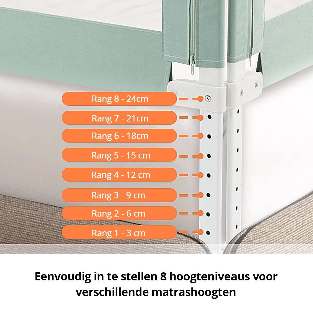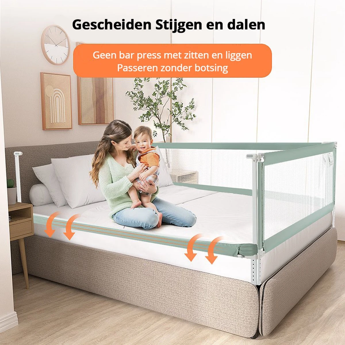 Exclusief naadloos ontwerp: De onderste stang van het bedhek drukt stevig op het matras om te voorkomen dat er een spleet ontstaat tussen het hekje en het matras, waardoor uw kind kan vallen of in de spleet vast kan komen te zitten.