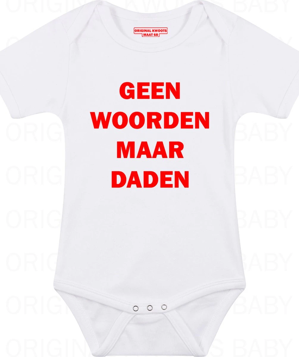De GEEN WOORDEN MAAR DADEN rompers zijn leverbaar in de maten: 56 / 68 / 80 / 92 en in de volgende kleurvarianten: