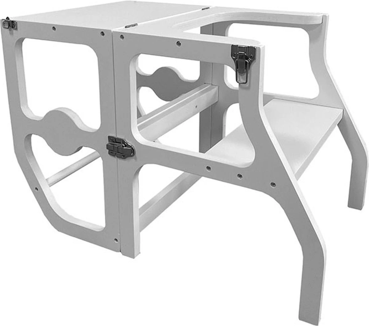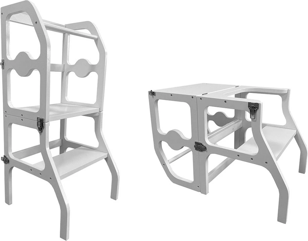 Doordat de leertoren opklapbaar is heeft deze meerdere functies. Zo kan hij dienen als hulp in de keuken maar ook als tafeltje. Hier kan uw kleine zelfstandig aan knutselen. Zo blijven uw handen mooi vrij om het werk in de keuken te doen. Doordat deze opklapbaar is, is het ook erg makkelijk op te bergen of in de ruimte op te laten gaan als meubel. Zorg wel dat u altijd toezicht houdt op de kleine gebruiker.