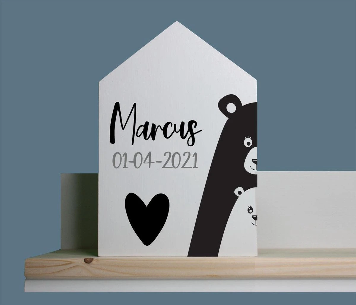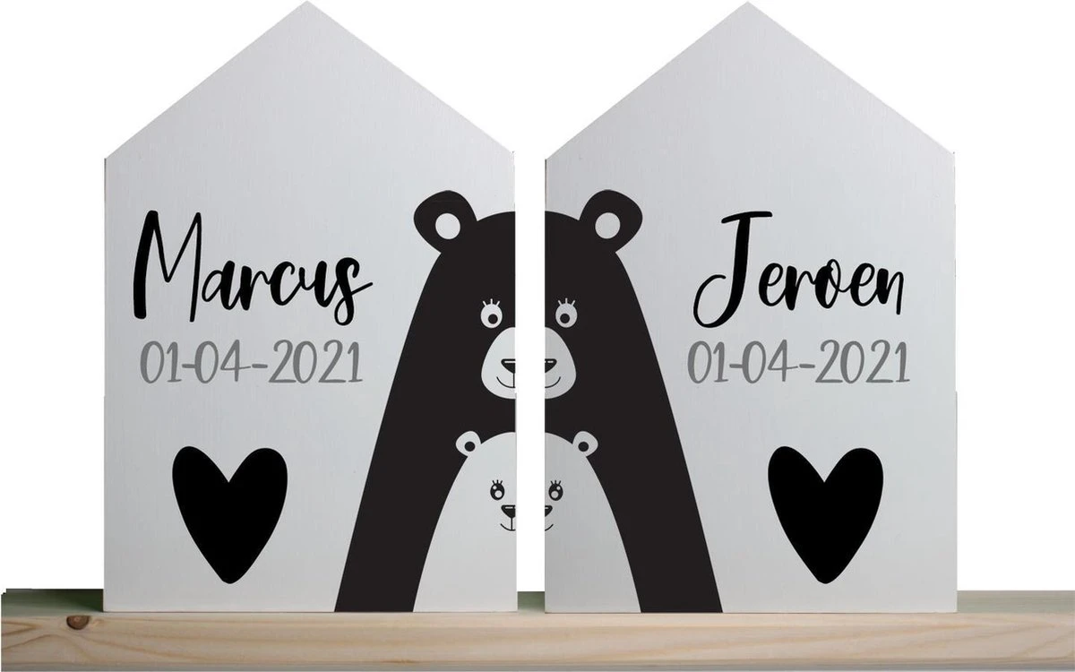 Een origineel (kraam) cadeau voor een tweeling. Op beide huizen staat de naam en de geboortedatum. De huisjes kunnen zowel los als tezamen worden gebruikt. Leuke en originele decoratie voor in de babykamer. Exclusief ontworpen voor Vorselaars Recreatie. De set bestaat uit twee huizen met elk een afmeting van 20 x 30 x 2,2 cm.