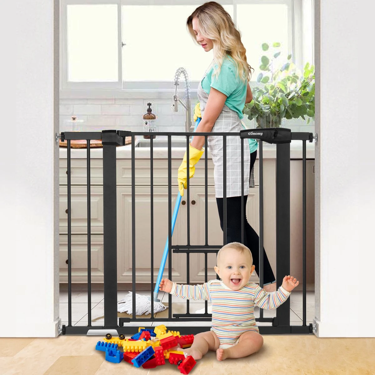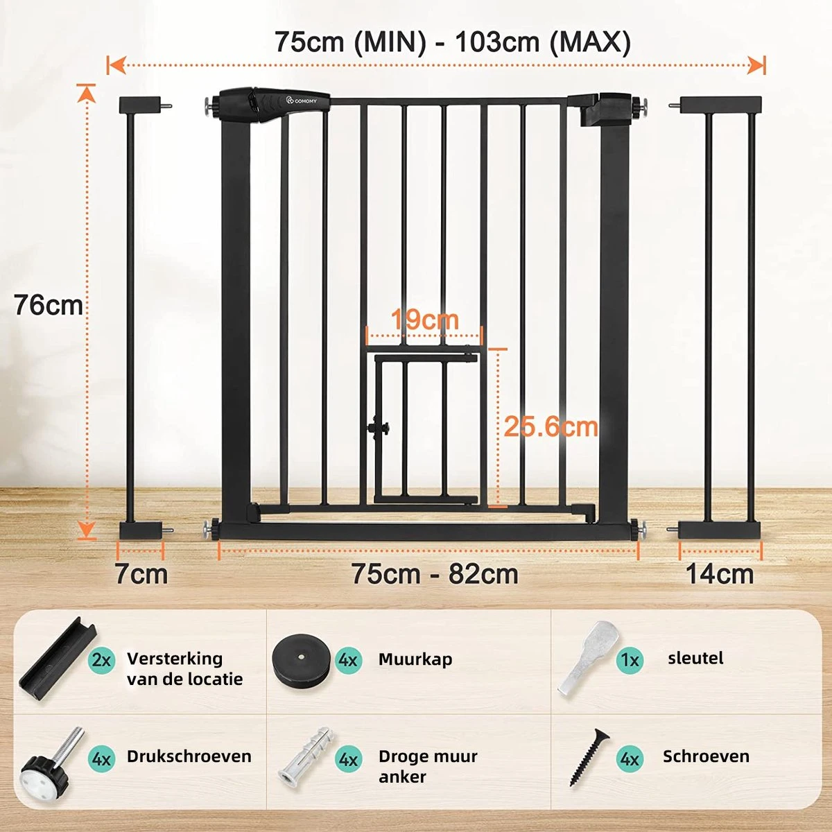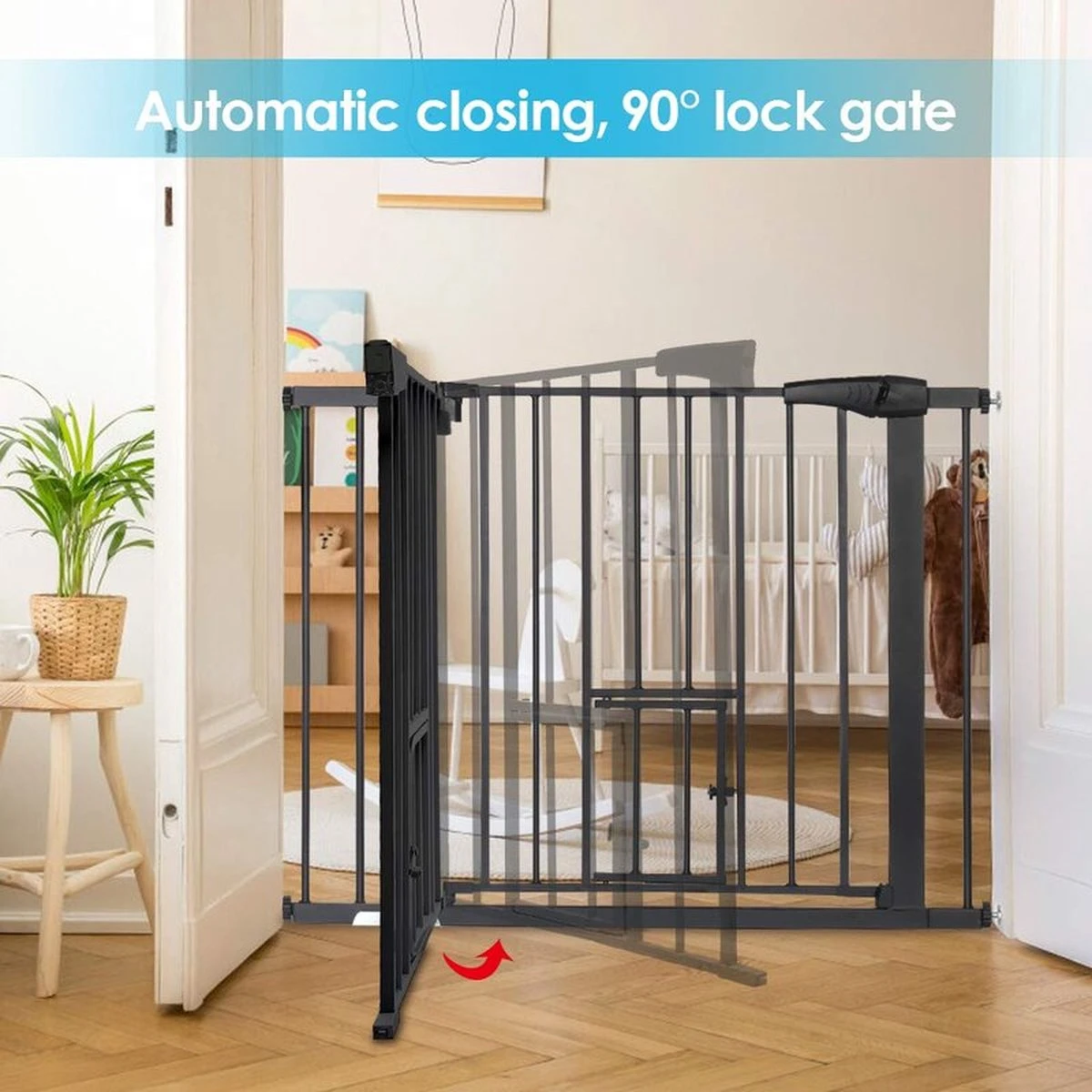 Het veiligheidshek heeft een klein deurtje voor huisdieren.
