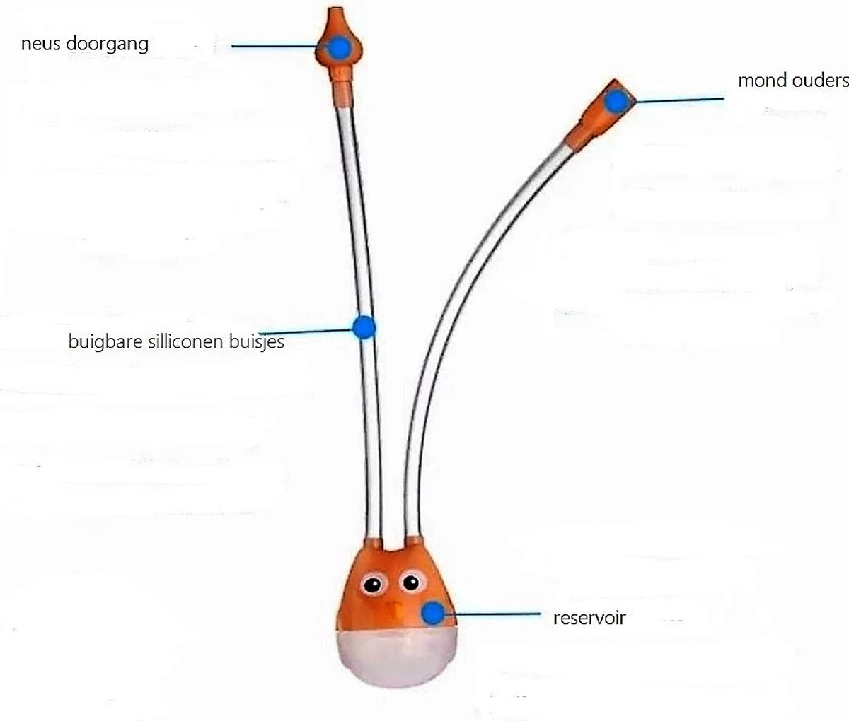-Plaats het tuitgedeelte in baby’s neusje en zuig aan het andere slangetje, vanzelf wordt het opgevangen in het tussenliggende bakje