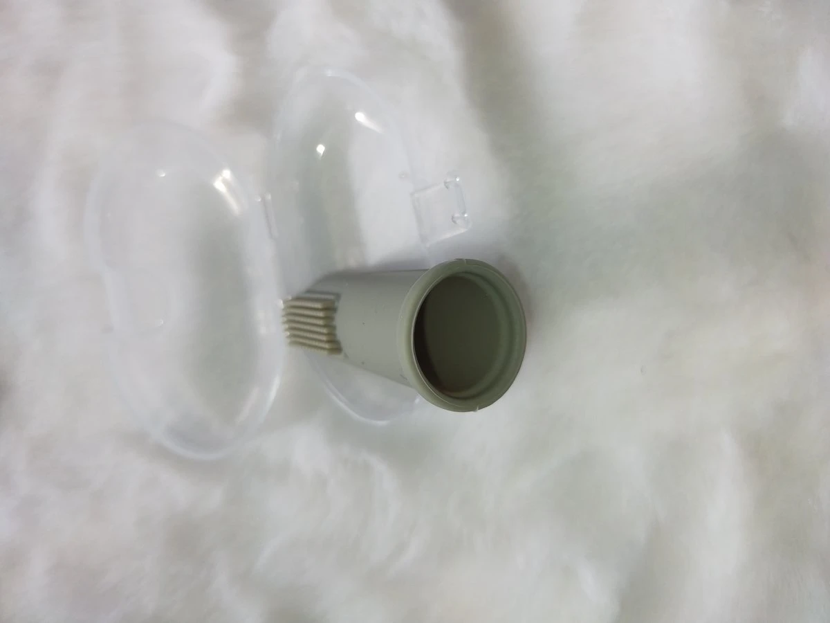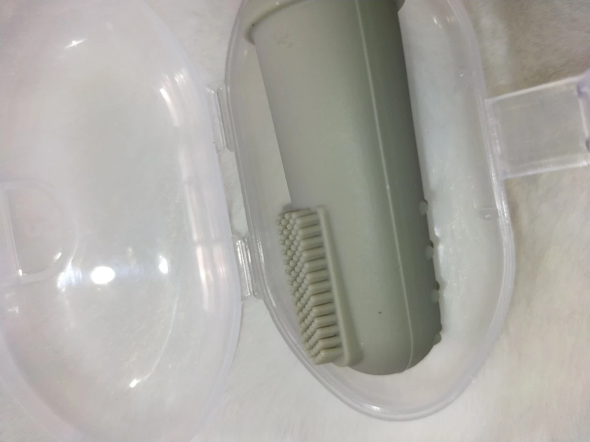 *De VINGERTANDENBORSTEL is zacht en klein en dus niet te groot voor je baby’s mondje om te poetsen.