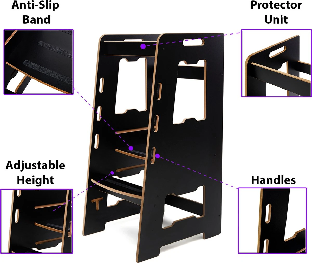 Verstel het trapje met het grootste gemak op drie verschillende hoogtes. Hierdoor kun je de leertoren lekker lang blijven gebruiken. Je kleine groeit zó snel! Met deze leertoren blijft je kind zijn of haar omgeving op een veilige en zelfstandige wijze ontdekken. De leertoren is geschikt voor zowel grote als kleine peuters.