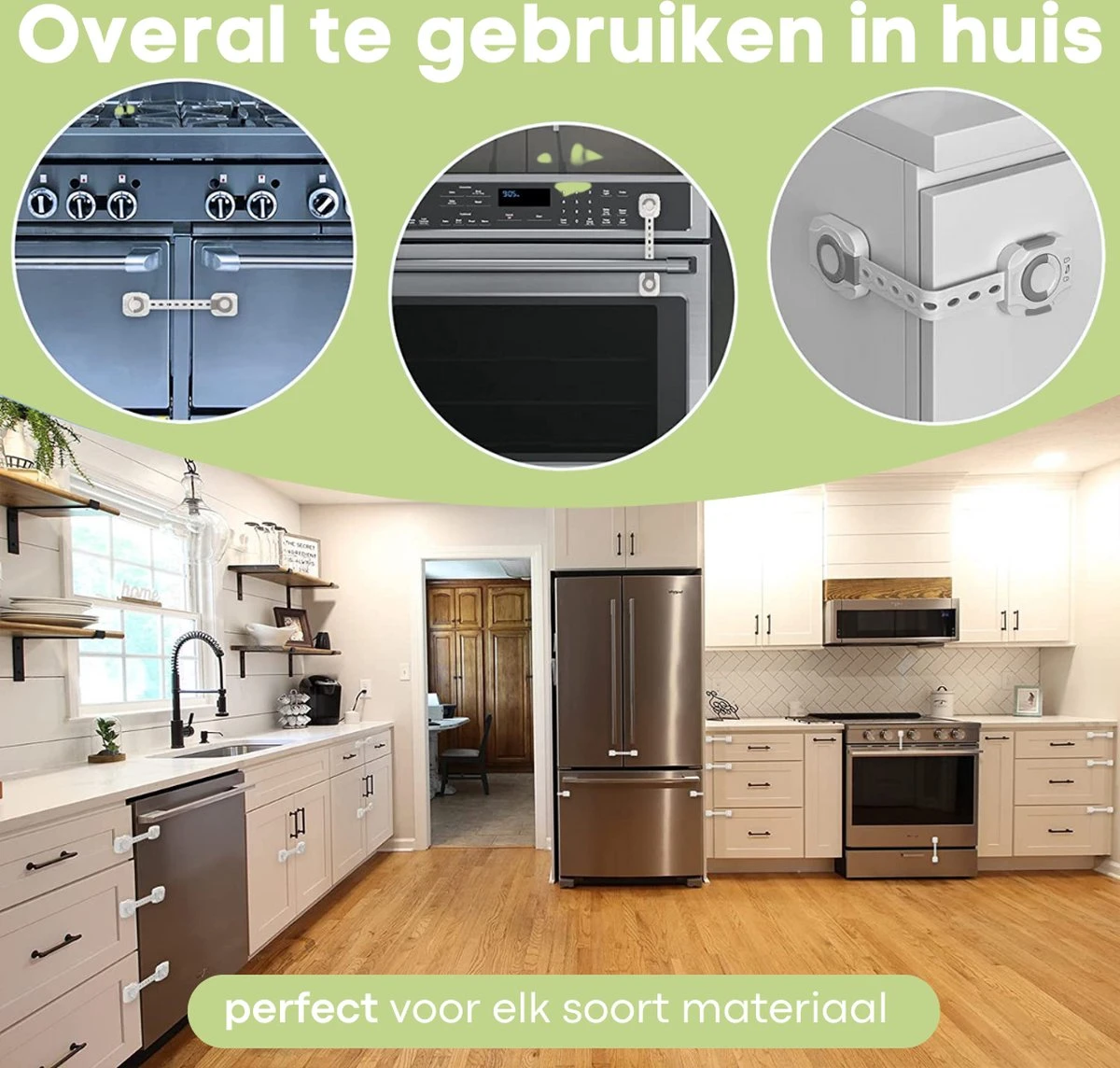 De veiligheidssloten zijn te gebruiken voor allerlei plekken in huis zoals in de keuken, badkamer, slaapkamers, voorraadkasten en andere opslagruimten. Dit product bestaat dan ook uit 6 veiligheidssloten waarmee vrijwel alle belangrijke delen van het huis beschermd kunnen worden.