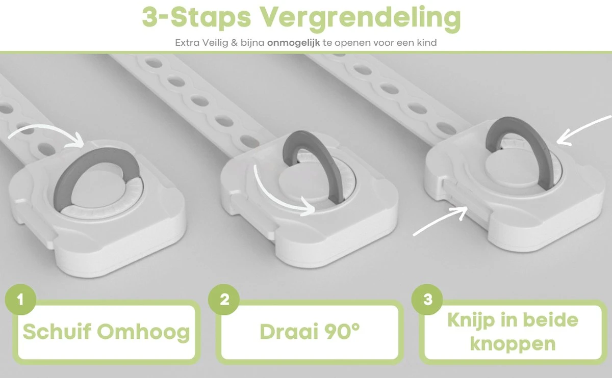 Waarom 2 staps beveiliging als u ook voor 3 staps kan gaan? Met ons nieuwe 3-staps vergrendel design zijn de sloten extra veilig. Het is voor volwassenen makkelijk te openen,maar je bent tegelijkertijd zeker dat je kind het slot niet kan openen.