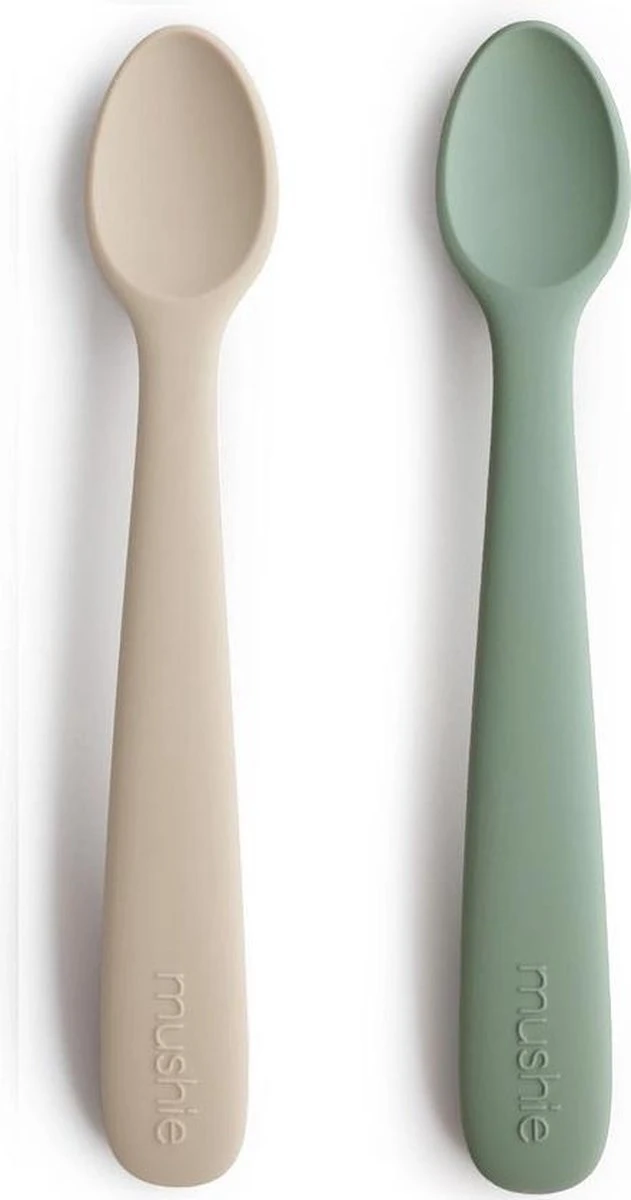 Een set babylepels van Mushie, twee siliconen lepels om van de eerste hapjes een feest te maken. Het kinderbestek is gemaakt van siliconen, dit beschermt doorkomende tandjes.