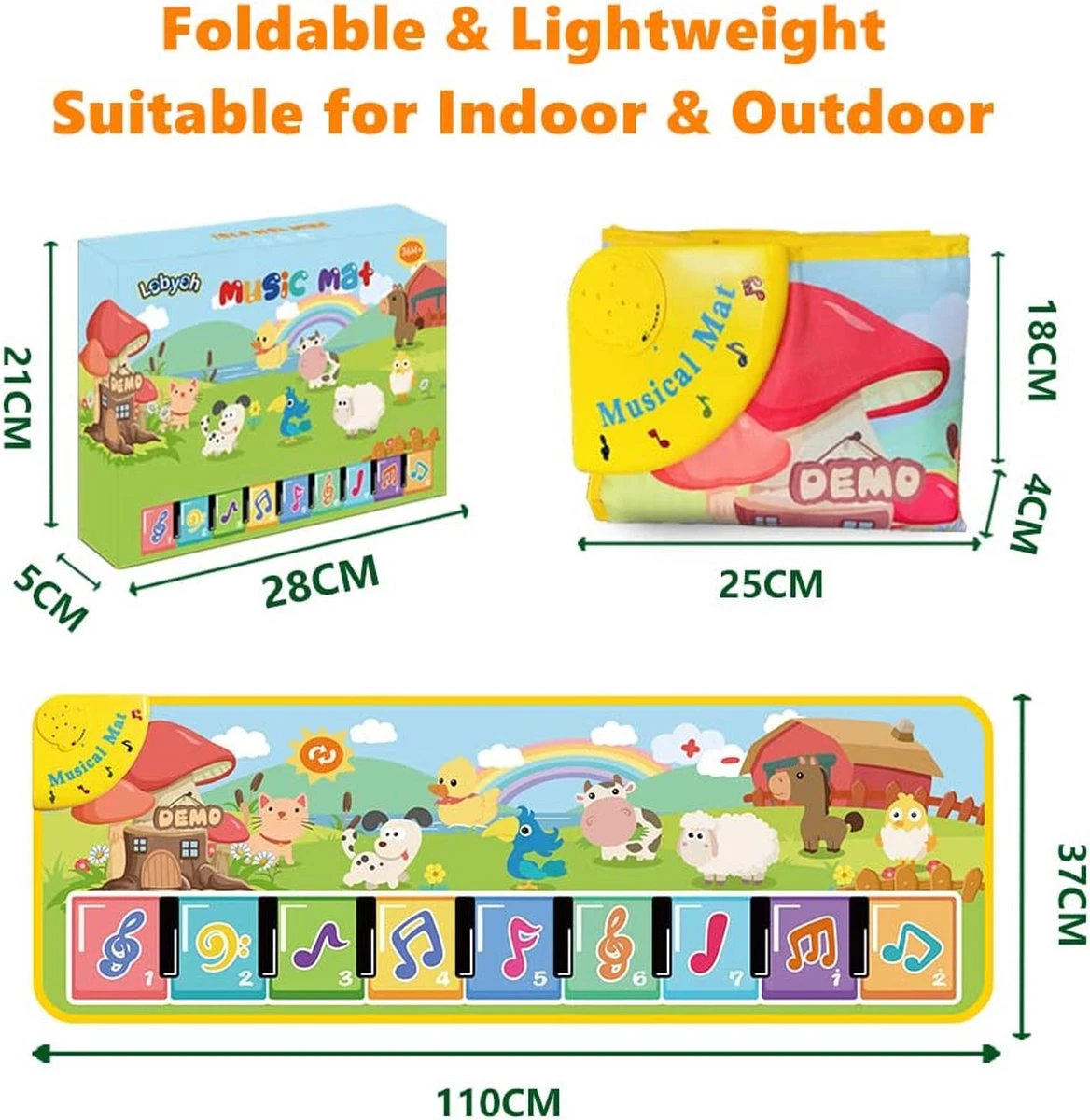 - Opvouwbaar en licht: de dansmat voor peuters kan tot 25 x 18 cm worden opgevouwen, originele afmetingen: 110 x 37 cm. De piano mat is geschikt voor binnen en buiten en kan gemakkelijk buiten worden opgeborgen en vervoerd. Aangedreven door 3 x AA-batterijen (niet inbegrepen).